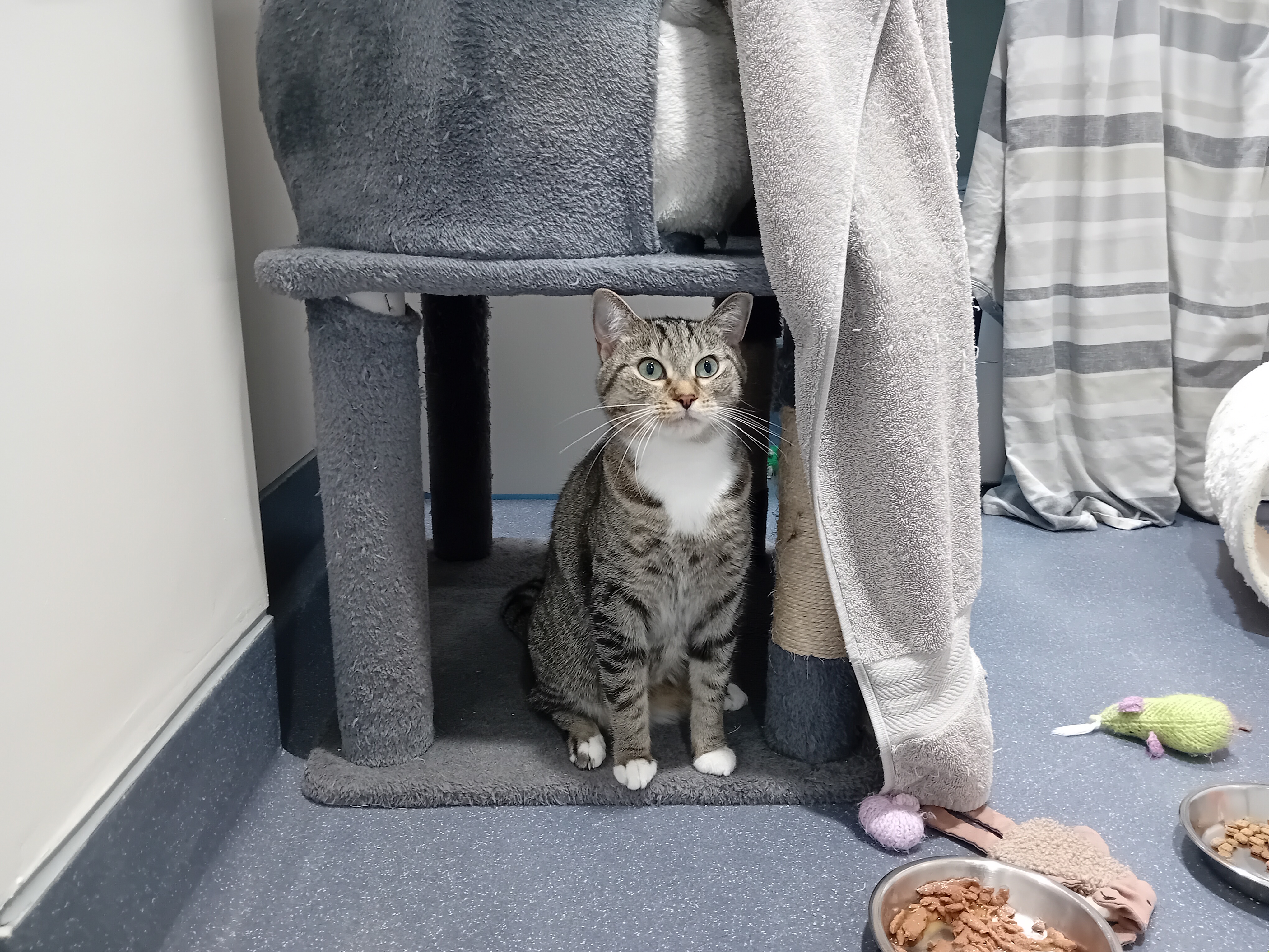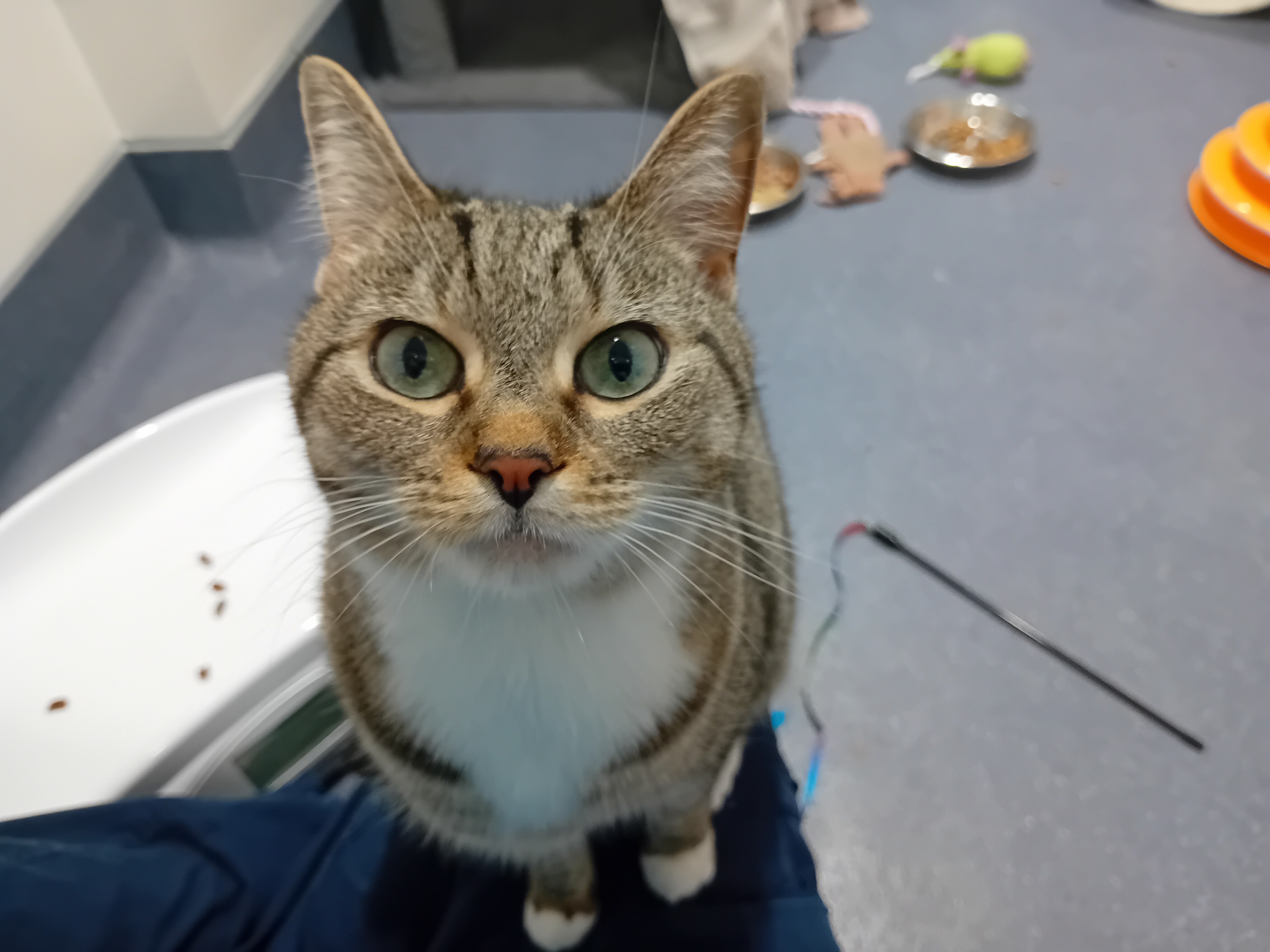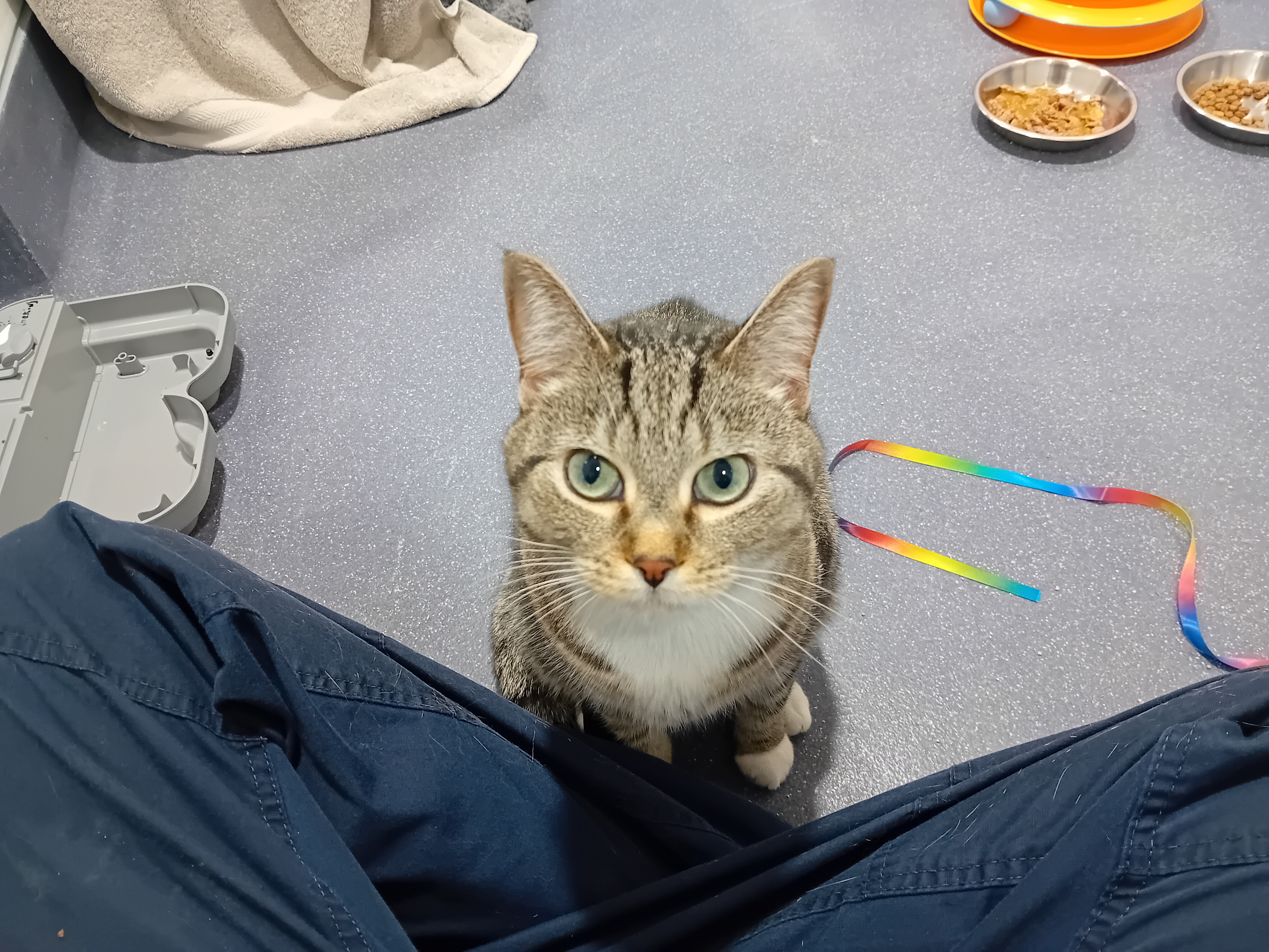 Bella is a real chatter box new owners will be lucky to get a word in when she's on a roll. She started to show her playful side and enjoys pouncing on a string toy.