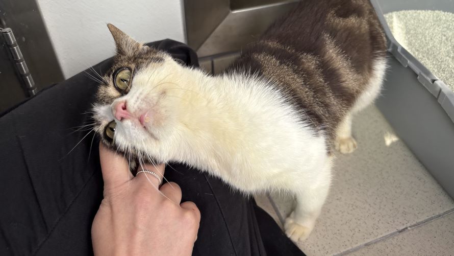 Now that she is feeling better, Bug has started to blossom. She adores having head rubs and leans into hands so much that she falls over sometimes!