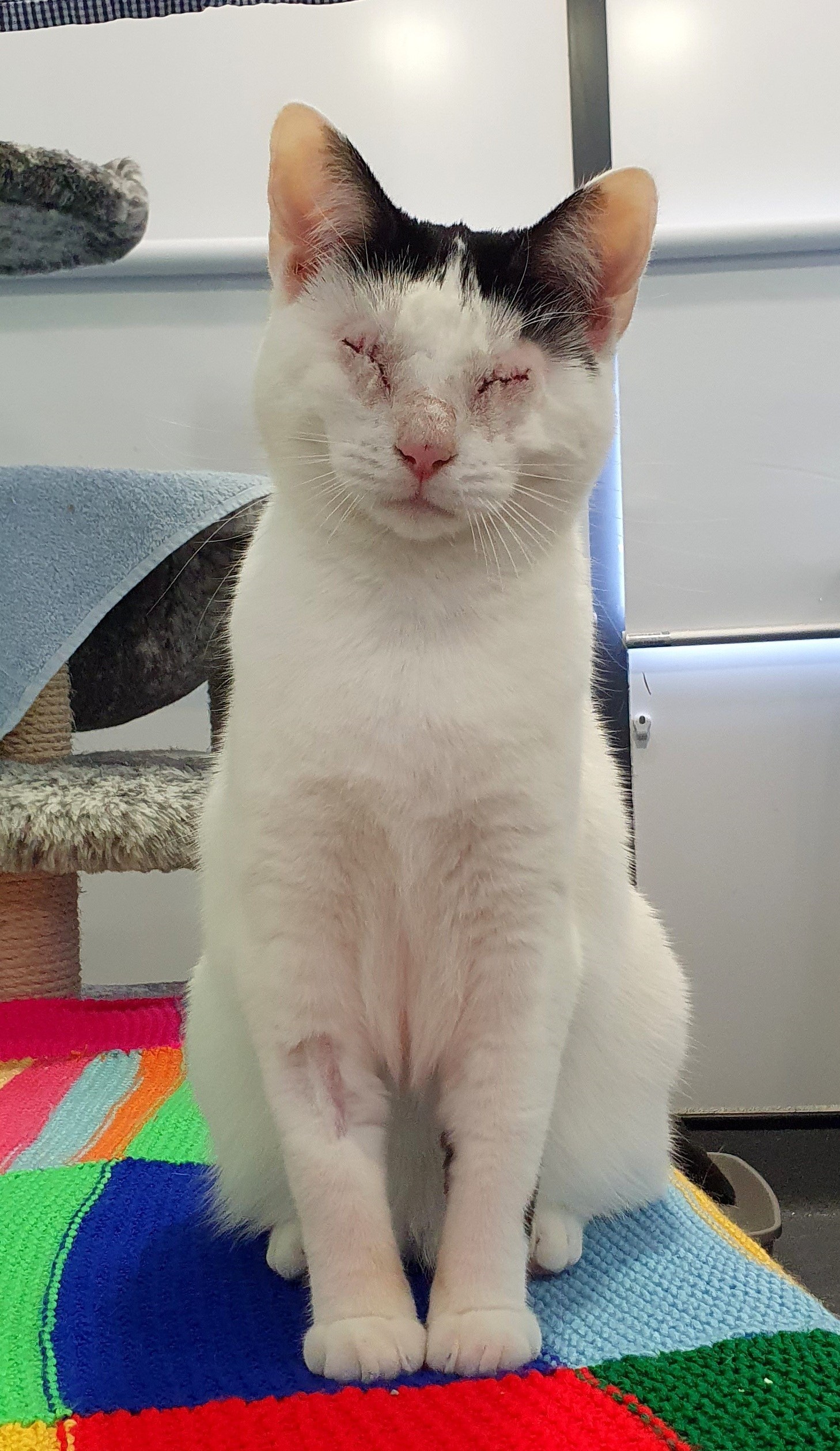 Don’t let her blindness fool you, Captain is full of curiosity, love, and playful energy! This sweet little girl adores affection, loves her cat tree naps, and enjoys chasing toys both on her own and with her people.