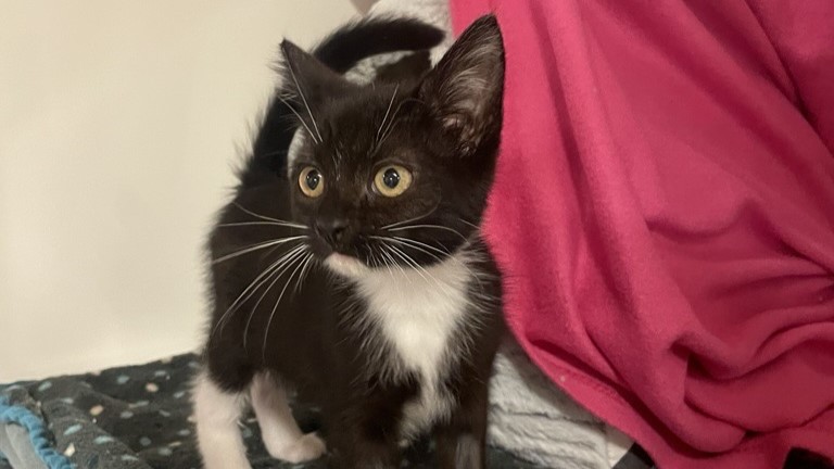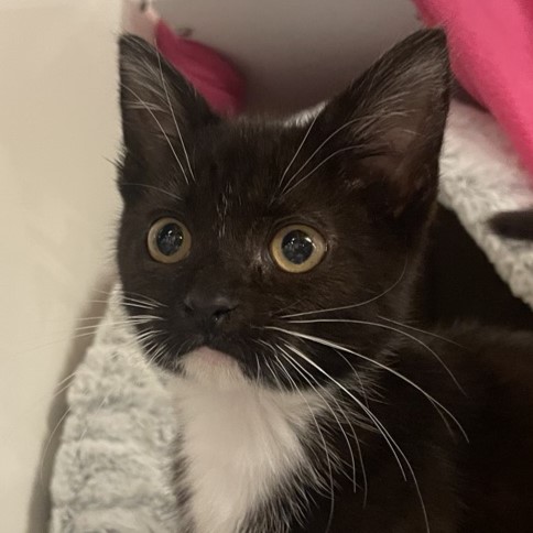 Jinx is an inquisitive kitten who loves to spend her time exploring and playing. She enjoys following her favourite people around and getting involved in whatever is going on, meowing for attention and fuss. Jinx loves nothing more than climbing on laps so she can have all the strokes, purring and kneading to show her affection!