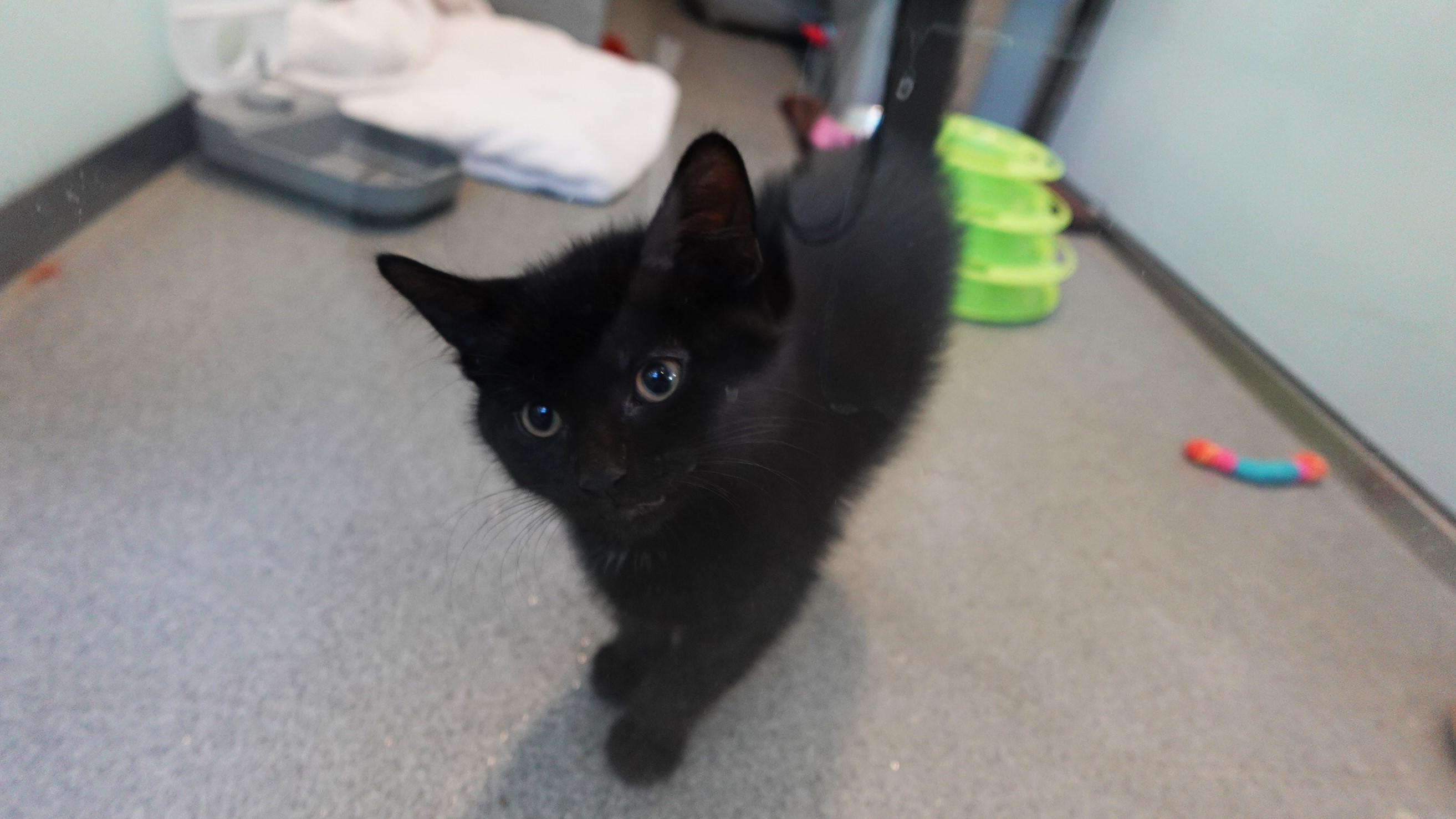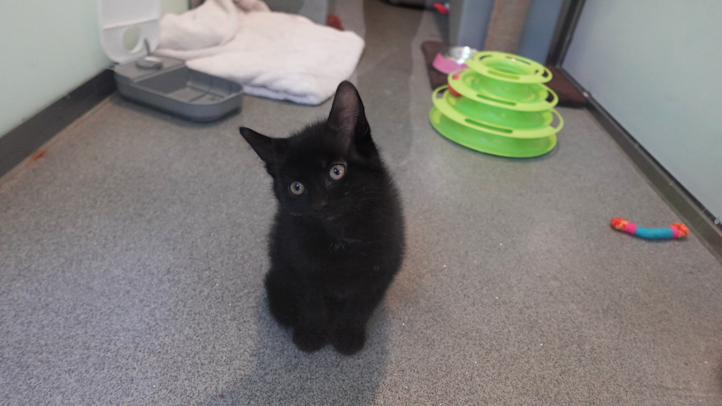 He is an active kitten and enjoys running around his pen kicking his balls around and wrestling with his knitted mice.