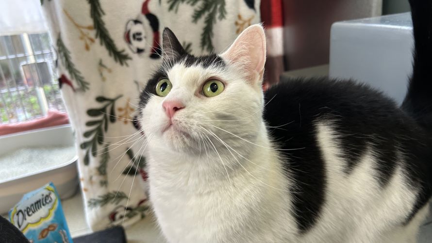 Patchy can take a bit of time to settle in, but once he does, his loving and affectionate side blossoms. He adores climbing into a lap or sitting next to his people, having a cheek scratch. He also enjoys climbing up high and watching the world go by!
