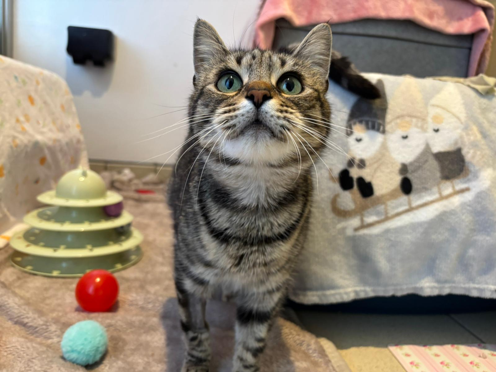 Once she feels comfortable, Solstice shows her affectionate side. She enjoys gentle fuss, leaning in for strokes and chin rubs, and will purr softly while spending time near you. She is growing in confidence each day but will need a calm, patient home that can give her the time and space she needs to feel secure.