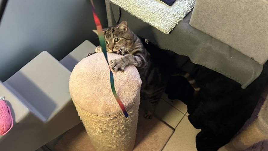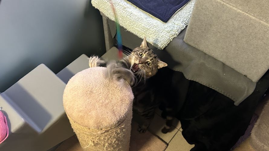 Tigger has come on leaps and bounds since arriving to the cattery. He was initially quite worried, but has since grown in confidence. He is straight over to greet staff and will lean in for lots of head rubs whilst climbing on a lap. He also adores chasing his string toy or batting his toy mice around his pen.