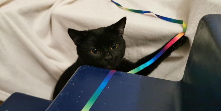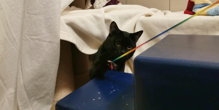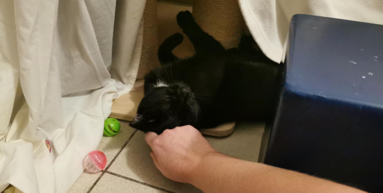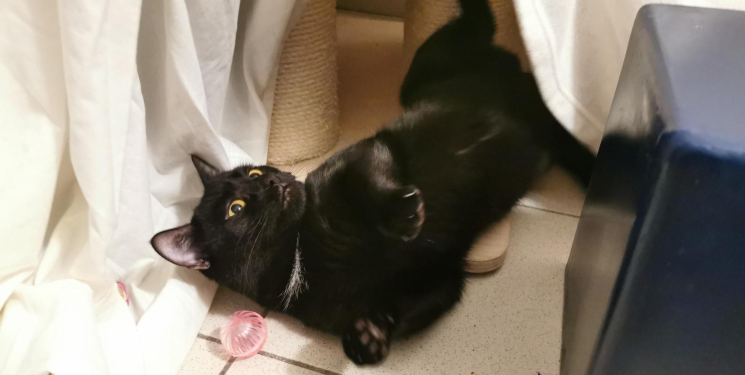 He can be a chatty chap and will tell you all about his day. He is young at heart and adores playing with his toys, especially chasing around a ribbon toy. A tasty treat is also well received followed by some cheek rubs. Once given a little time and space, he shows his content by flopping on the floor, purring and rolling around before head bumping your hand for more.