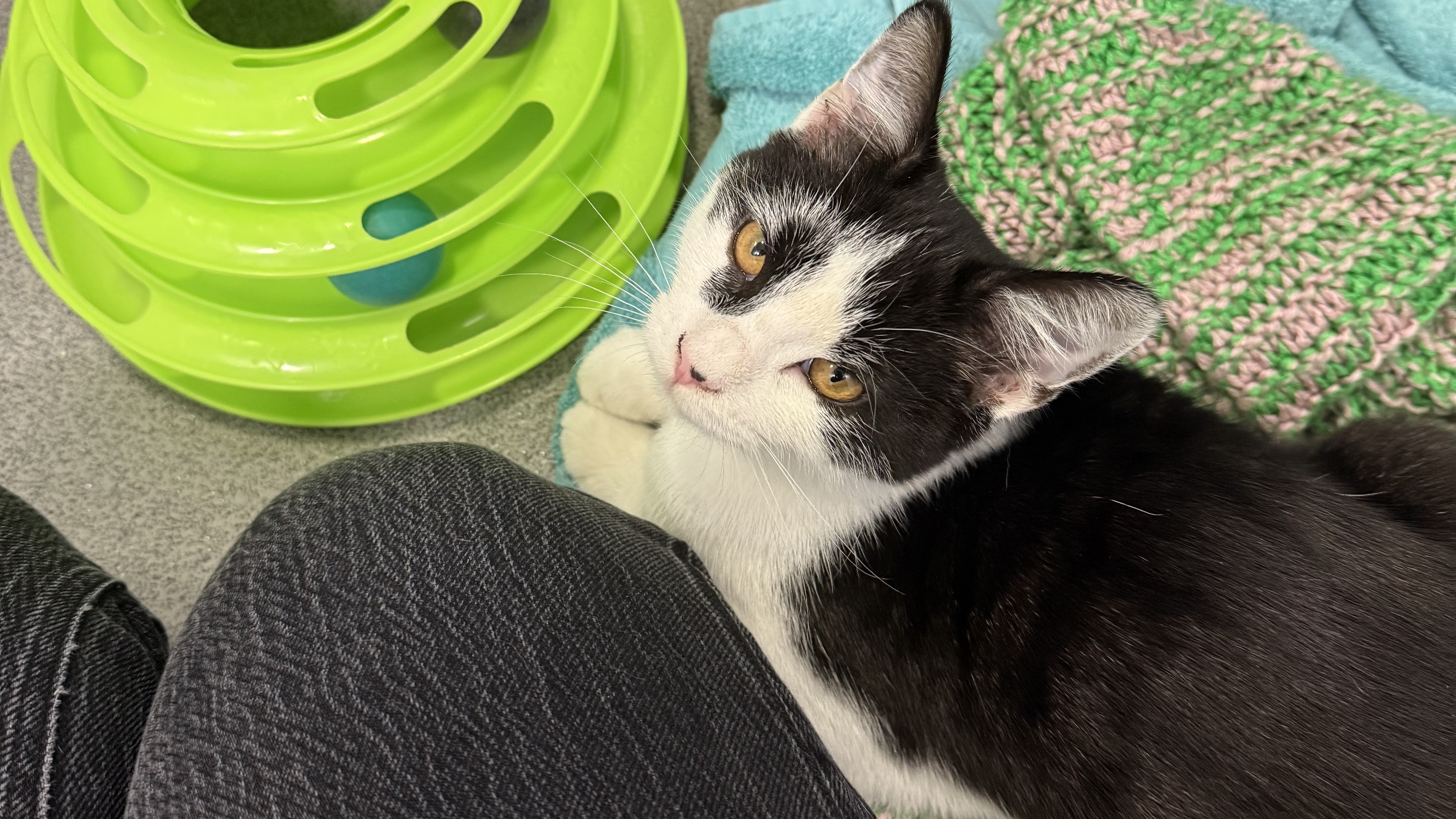 Whiskers adores company and will greet all visitors with lots of head bumps and meows.