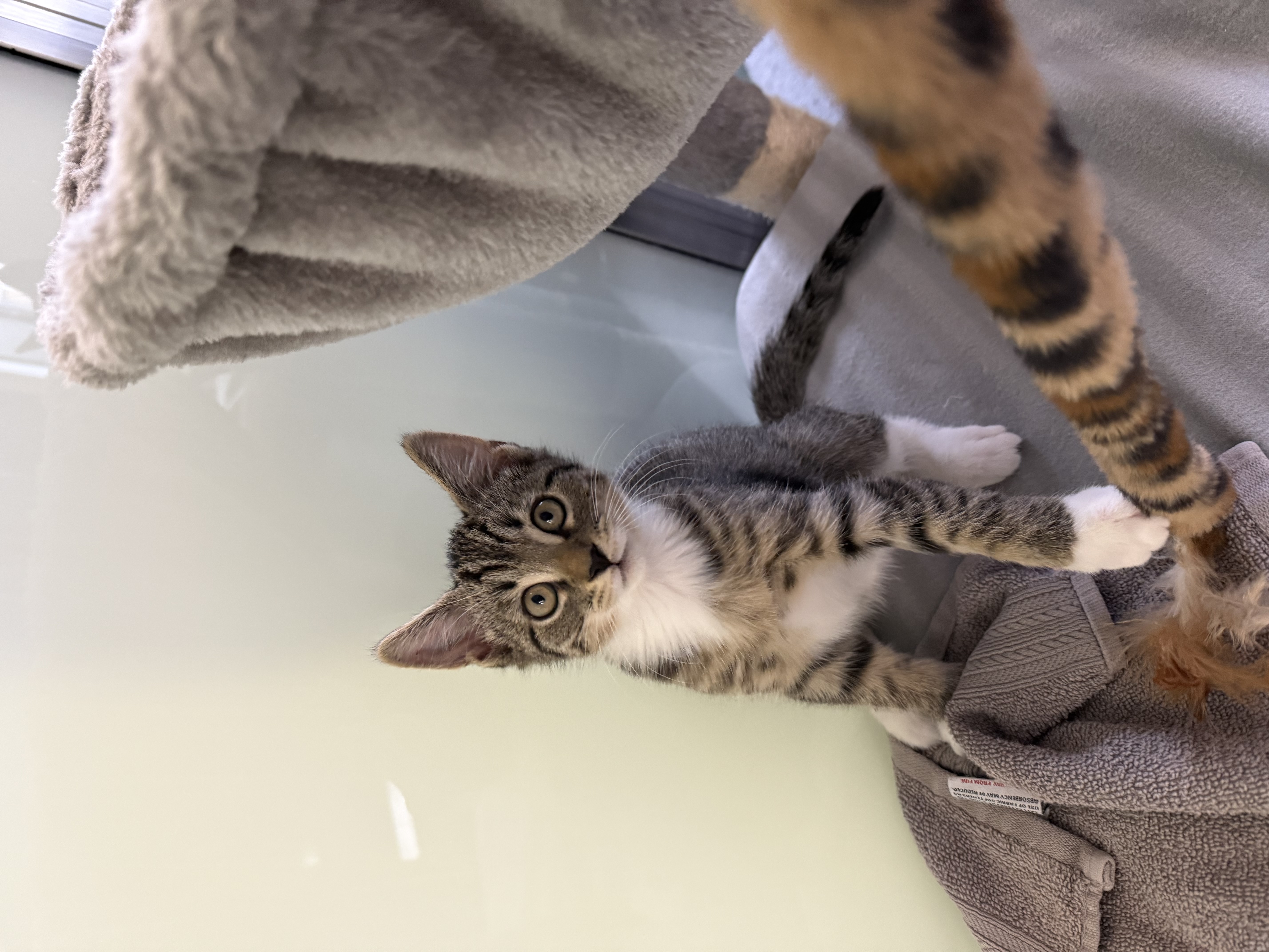 He is full of energy and loves to chase, pounce and stalk his knitted mice and string toy.