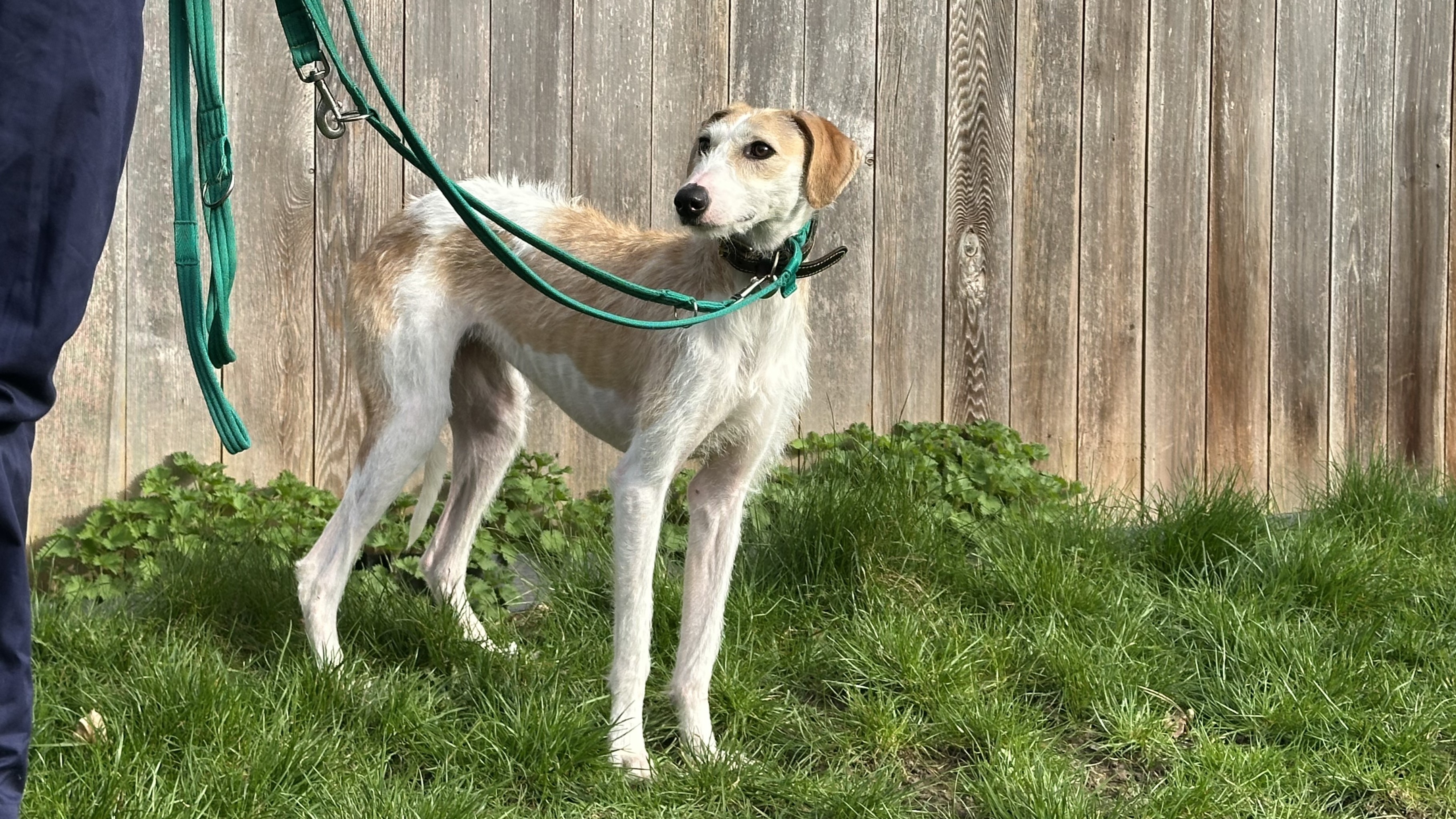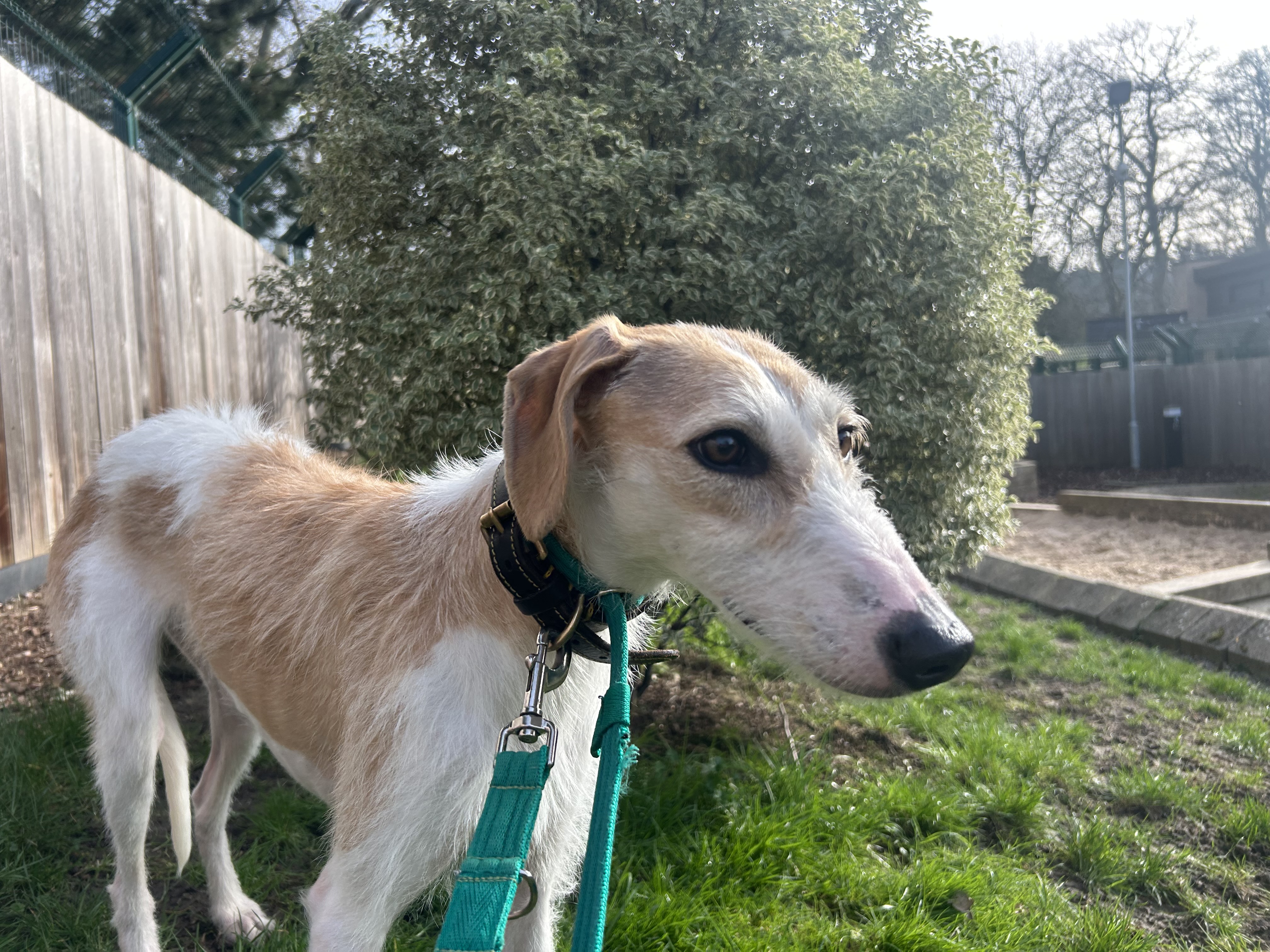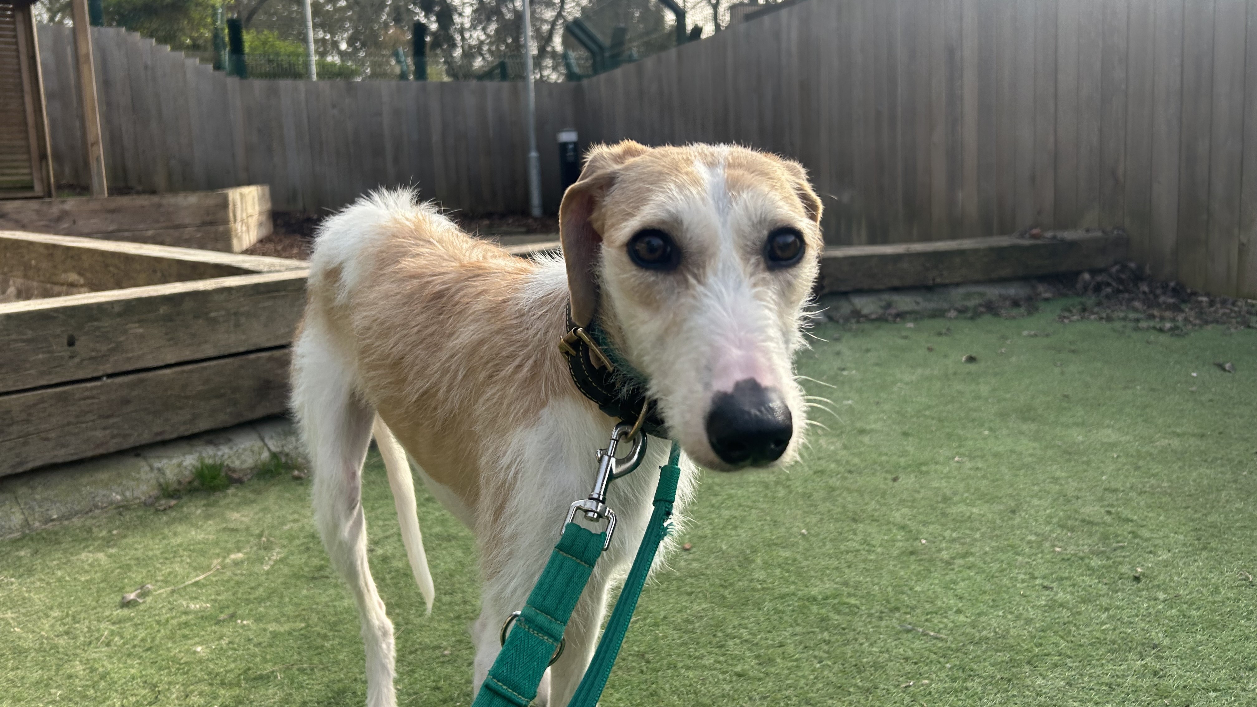 Agnes is a sensitive Lurcher who is looking for a home with an existing dog that could be a great role model for her.