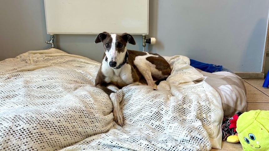 In her previous home, Anna found it difficult when left on her own and could become quite stressed, which sometimes led to her chewing items. Despite this, she was able to sleep independently in the kitchen overnight. She is currently learning a “bed” cue and practising how to relax by herself. Continuing this gentle training at home will really help her grow in confidence and feel secure.
