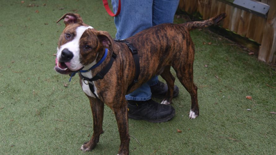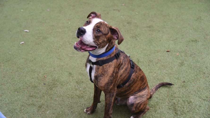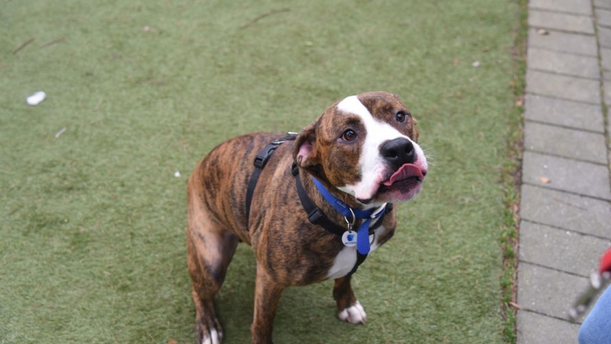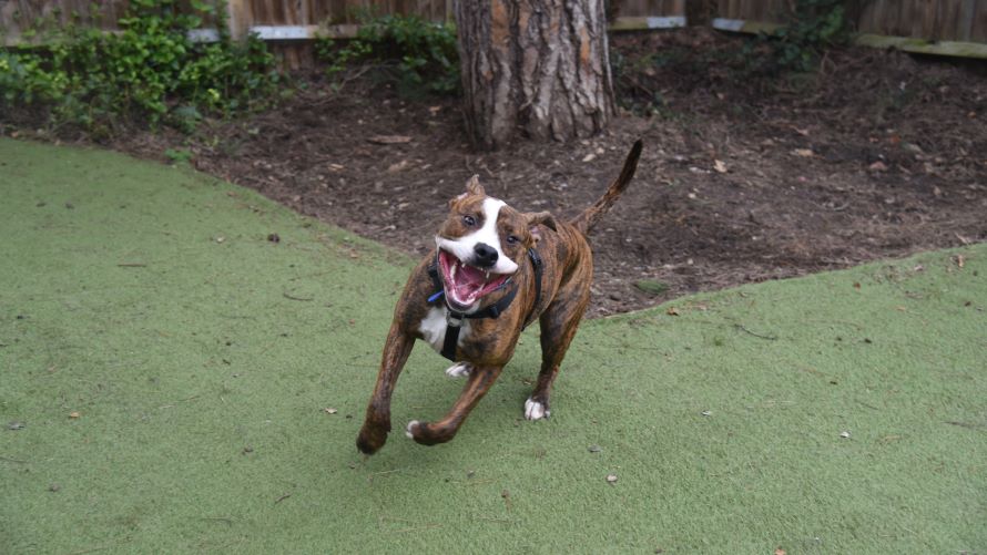 Toy play is great fun for Arlo, he has really enjoyed running around and tugging games. He can be boisterous, typical bull breed play just having fun. For the most part he walks nicely on lead, but a squirrel is very exciting distraction so new owners need to feel confident handling Arlo.