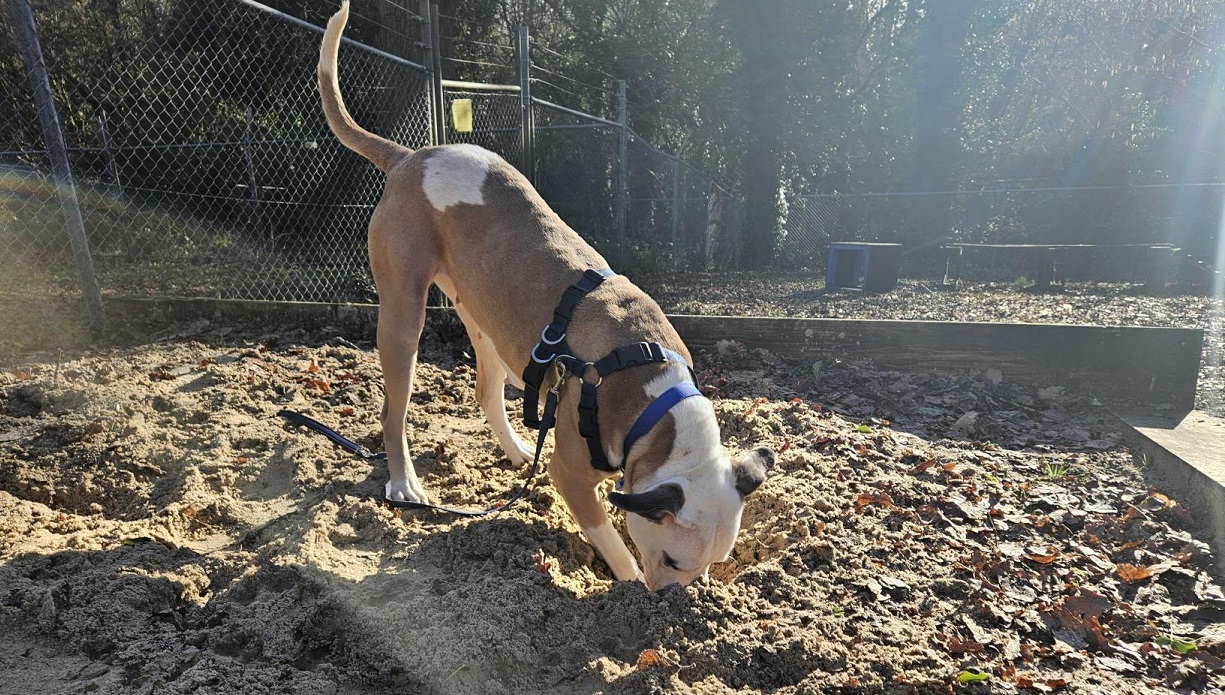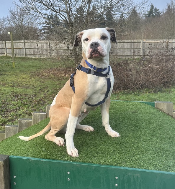 Coco can be nervous of strangers and may use her voice to express her worry. She does, however, make friends very quickly with the right approach and now has a wide circle of friends at our centre. We have spent time training Coco to wear a head collar, which she walks very well on. Coco will need her own private garden for some house training reminders and would benefit from living in a settled household in a quieter location. Coco can at times be quite over enthusiastic when meeting other dogs, so will need new owners who are confident to continue her socialising and who ideally understand bull breeds and their sometimes 'forward' body language when they introduce themselves to other dogs! We have been working hard on Coco's dog interactions, providing her with some positive experiences where she has greeted other dogs and walked with them and she has made lots of great progress making good choices and remaining relaxed around the other dogs.