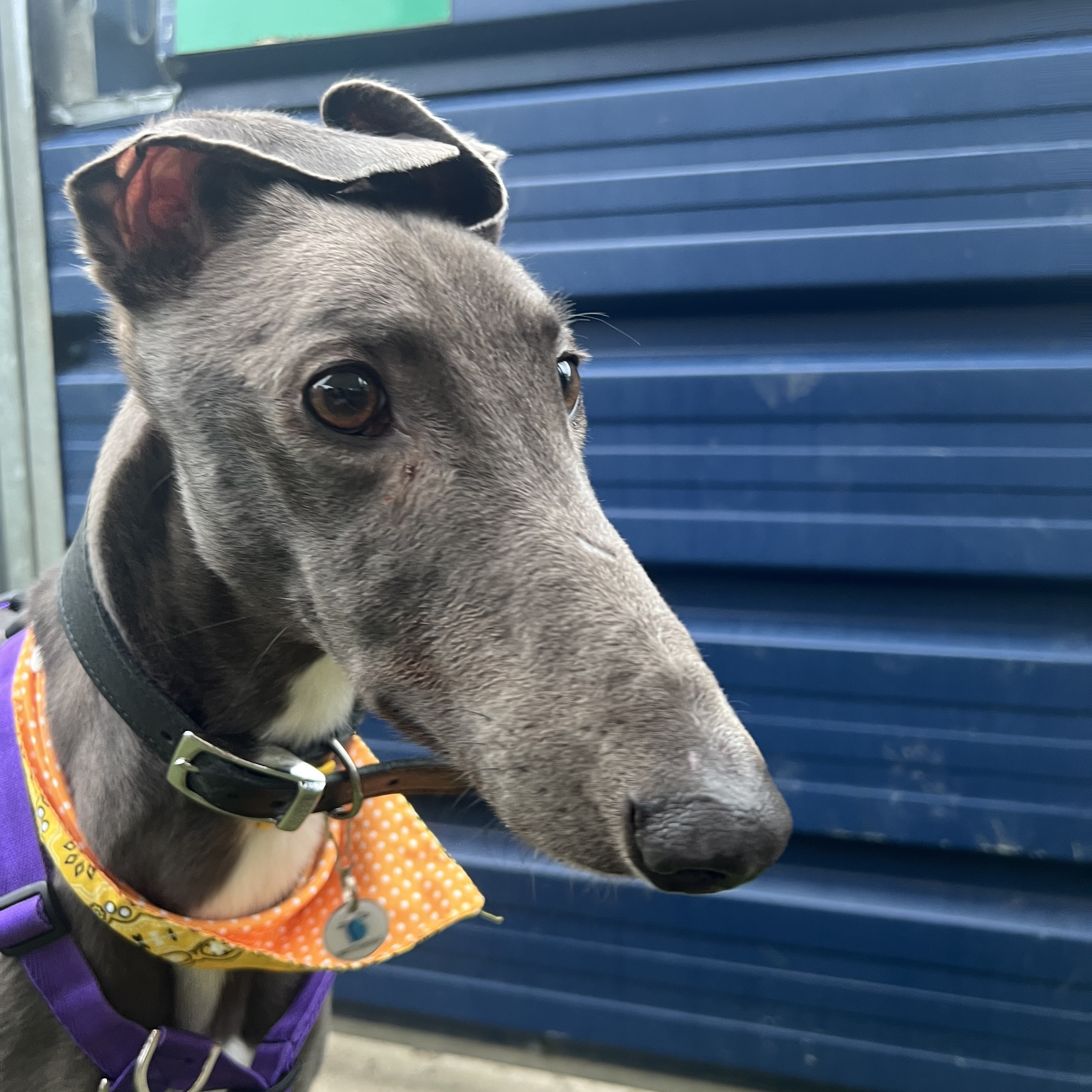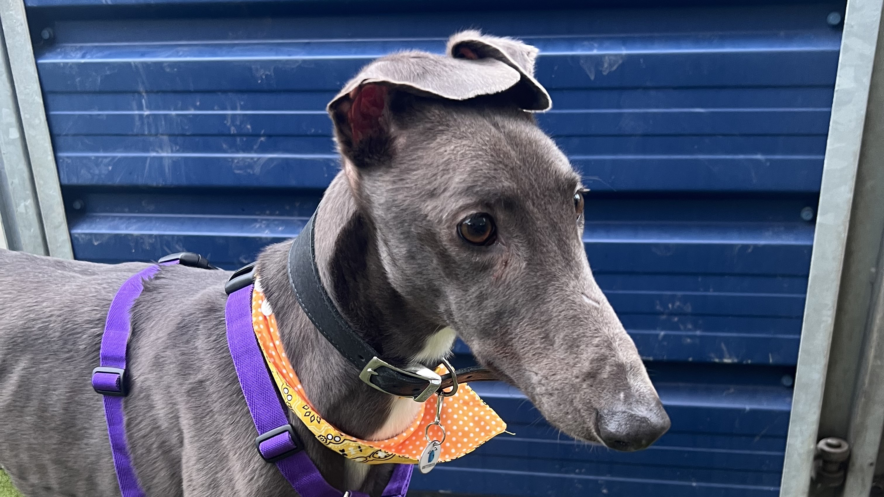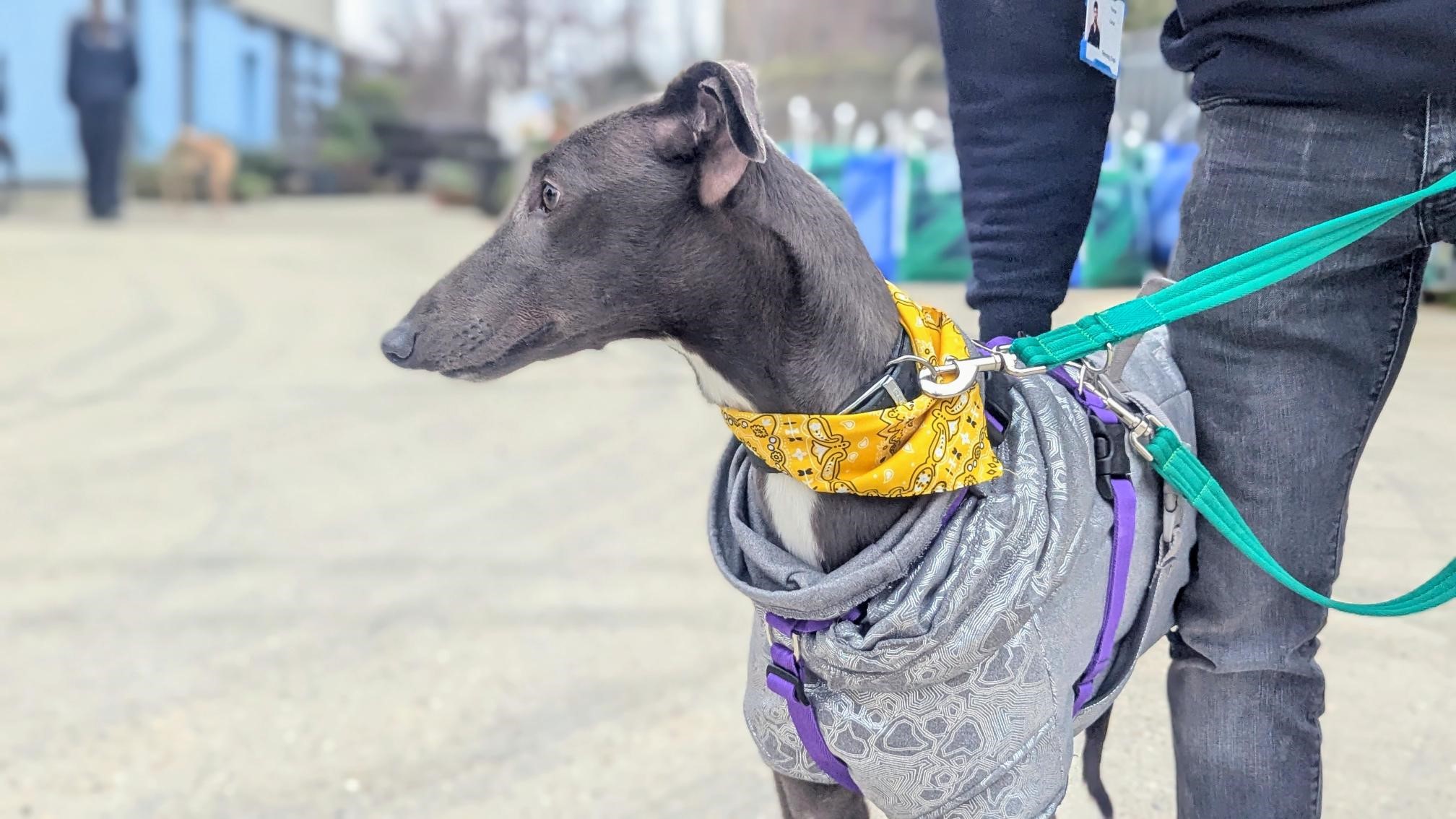 Dolce is a sweet and sensitive lady who is looking for a home where she can settle and rest her paws. She has been a worried girl with us around our busy London site, so a quiet home with patient owners would be ideal for her! Due to her racing background and high chase drive seen towards smaller animals, Dolce will need to be muzzled and on lead at all times when out and about.