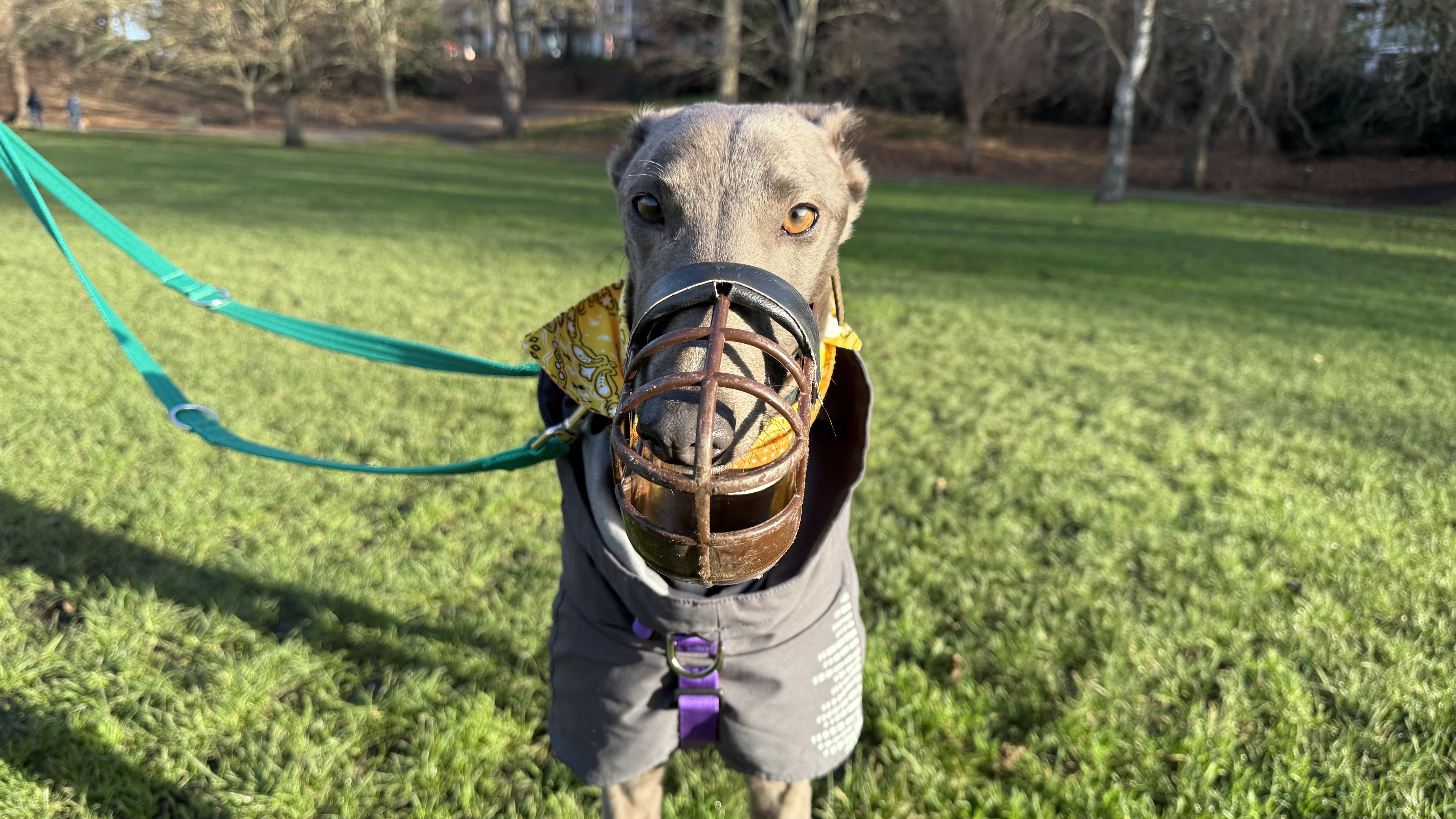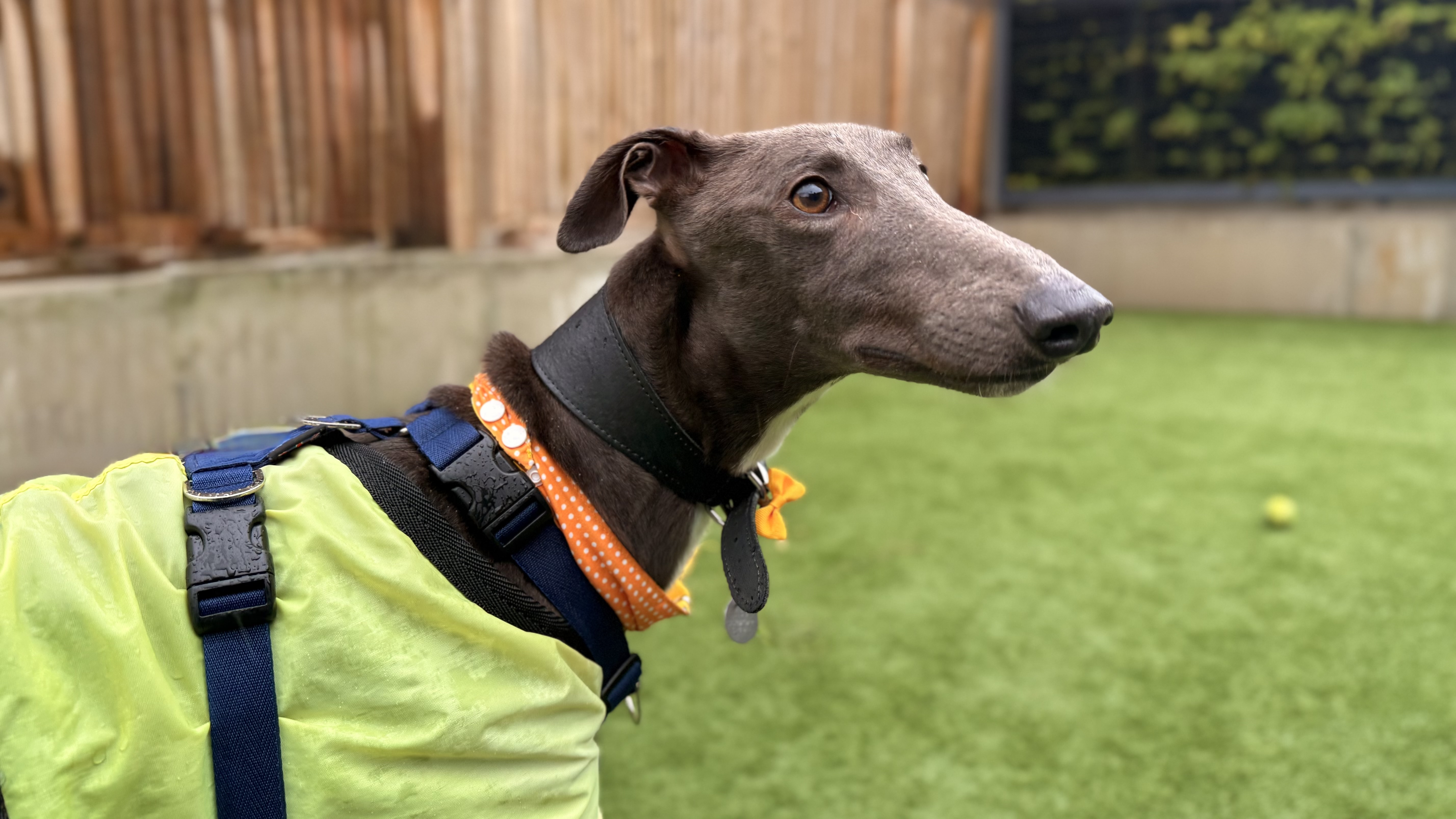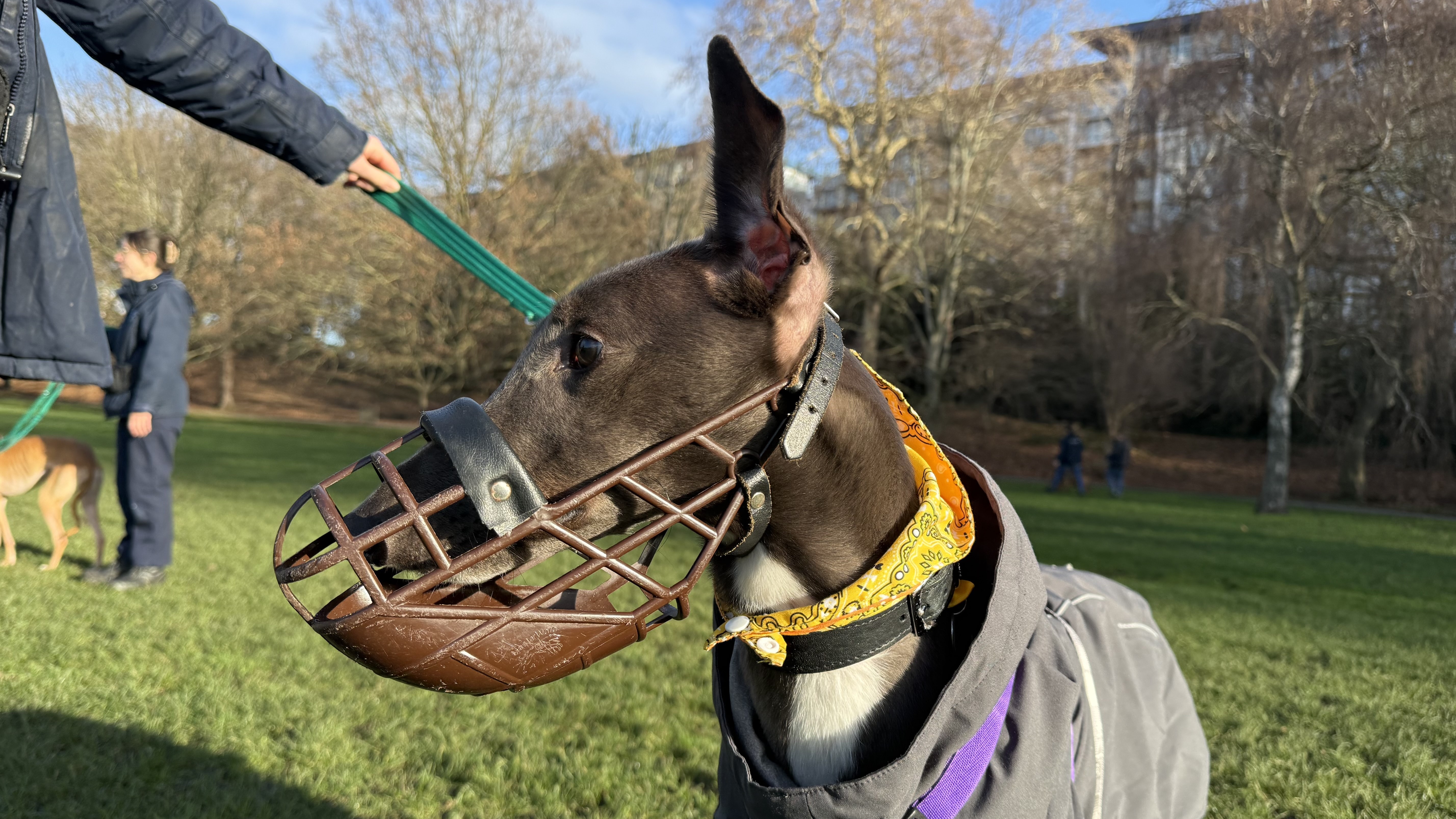 Dolce is another of our ex-racers. She is a sensitive lady looking for a home where she can settle and rest her paws. She has been a worried girl around our busy London site, so a quiet home with patient owners would be ideal for her! Due to her racing background and high chase drive seen towards smaller animals, Dolce will need to be muzzled and on lead at all times when out and about. She would really like to have her own garden to sniff around in.