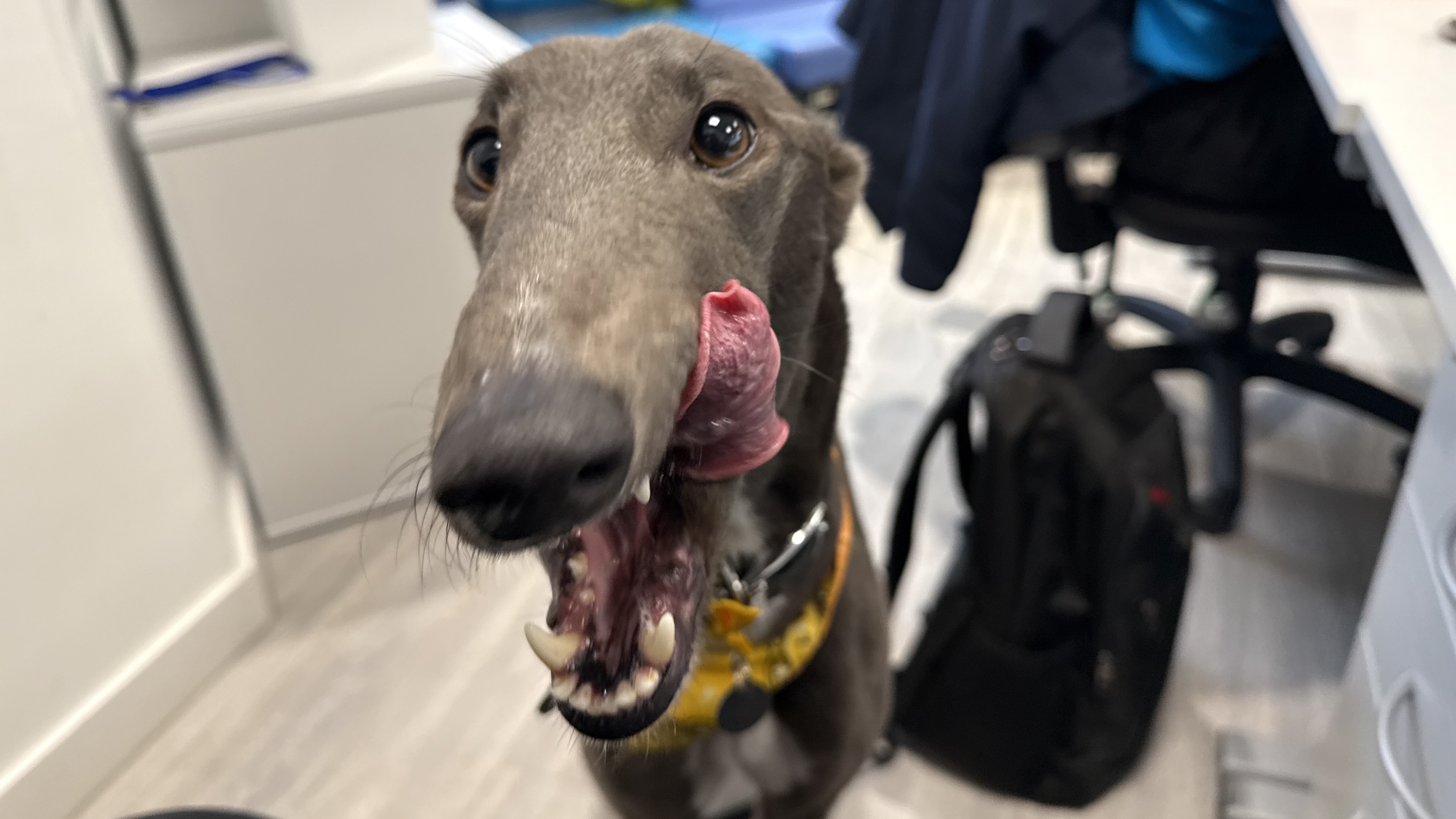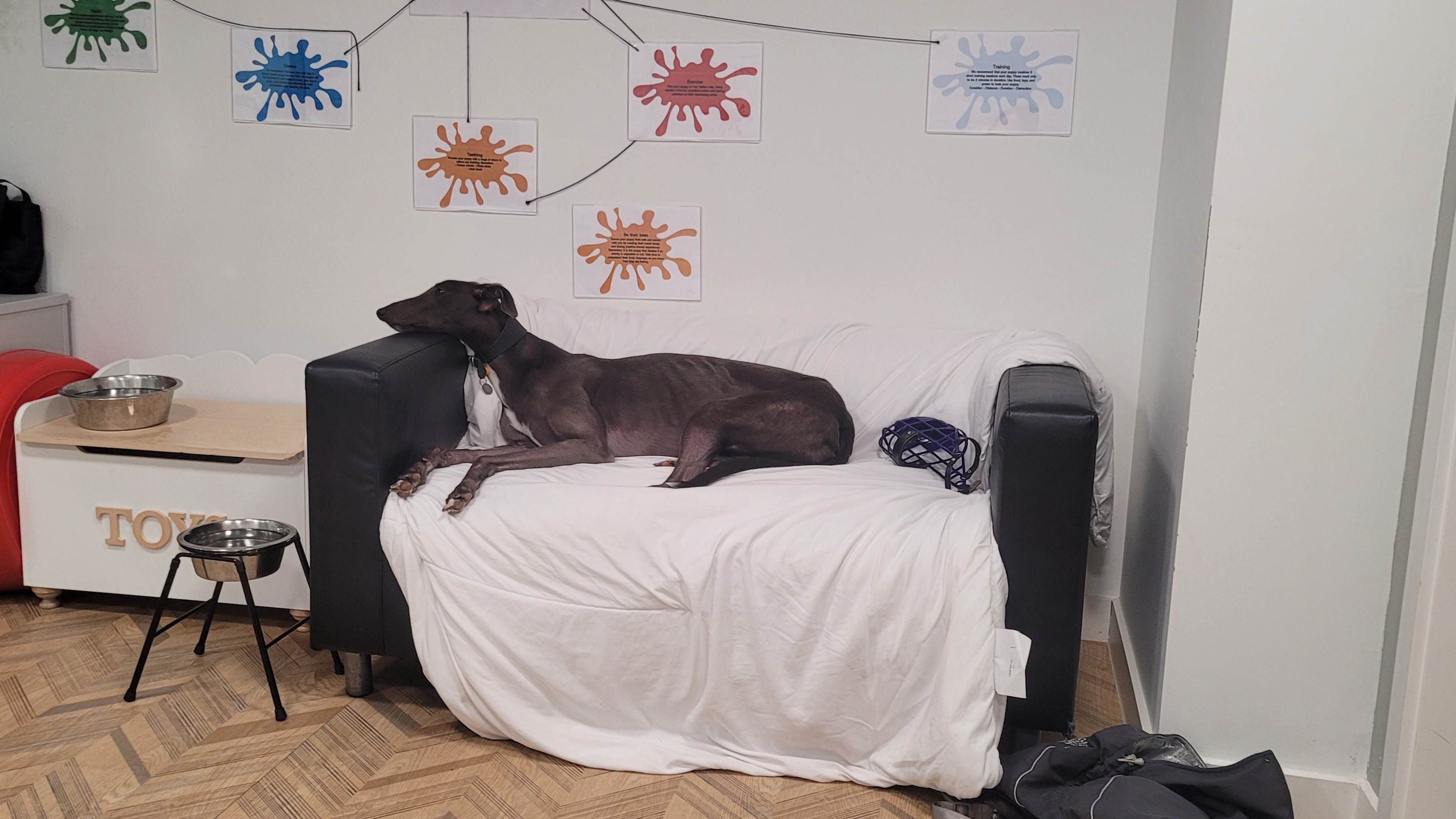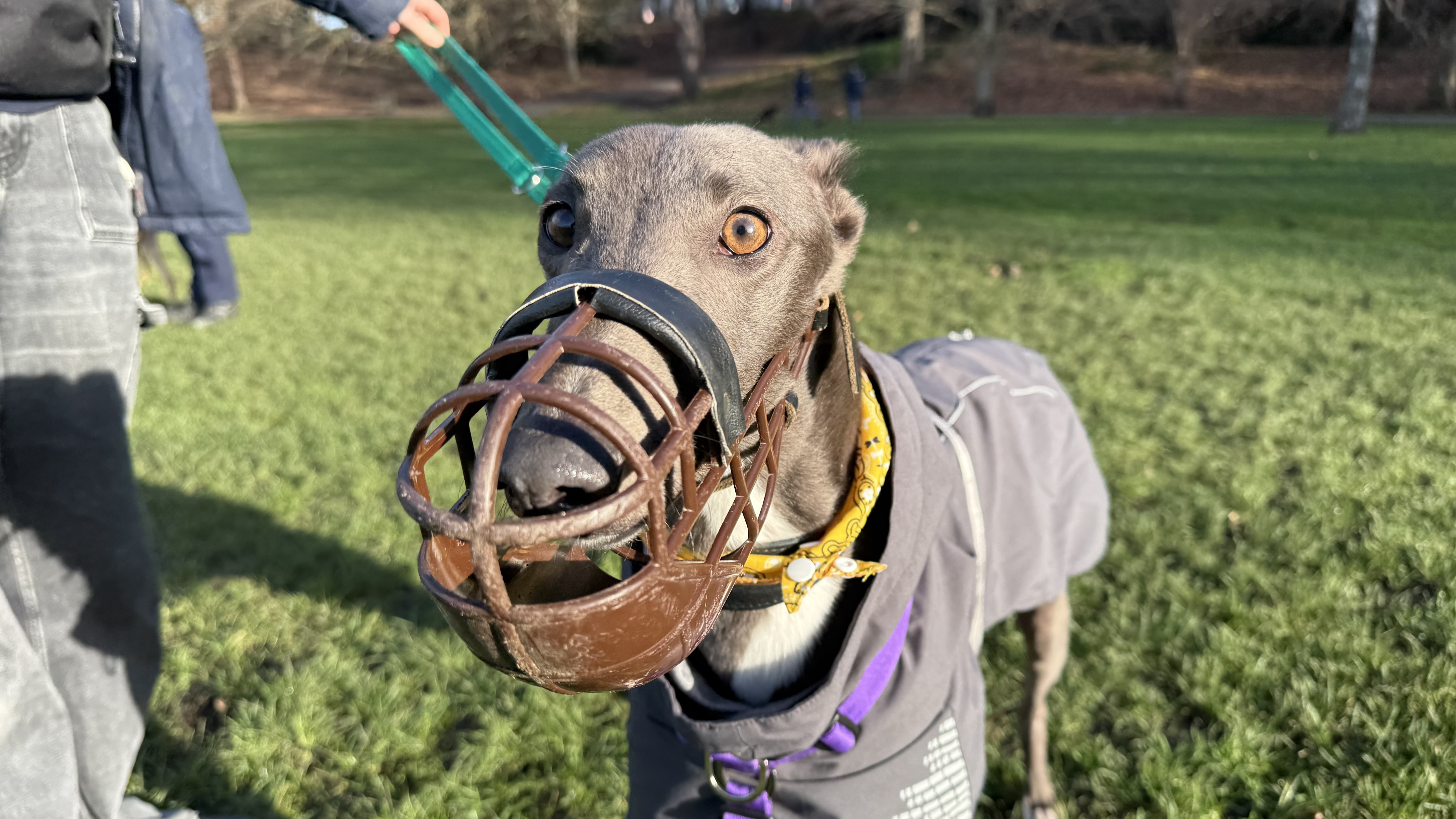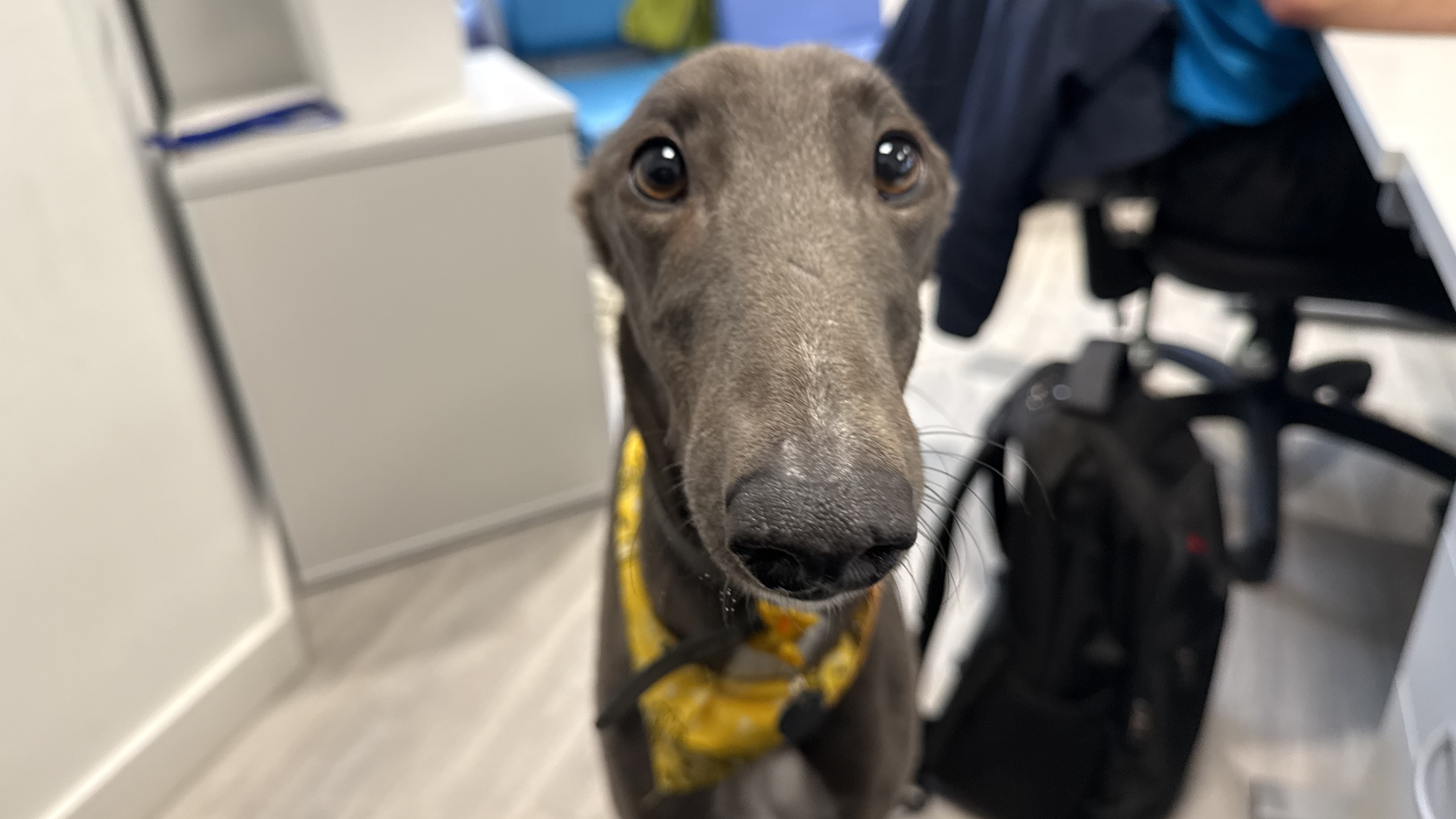 Dolce is another of our ex-racers. She is a sensitive lady looking for a home where she can settle and rest her paws. She has been a worried girl around our busy London site, so a quiet home with patient owners would be ideal for her! Due to her racing background and high chase drive seen towards smaller animals, Dolce will need to be muzzled and on lead at all times when out and about. She would really like to have her own garden to sniff around in.