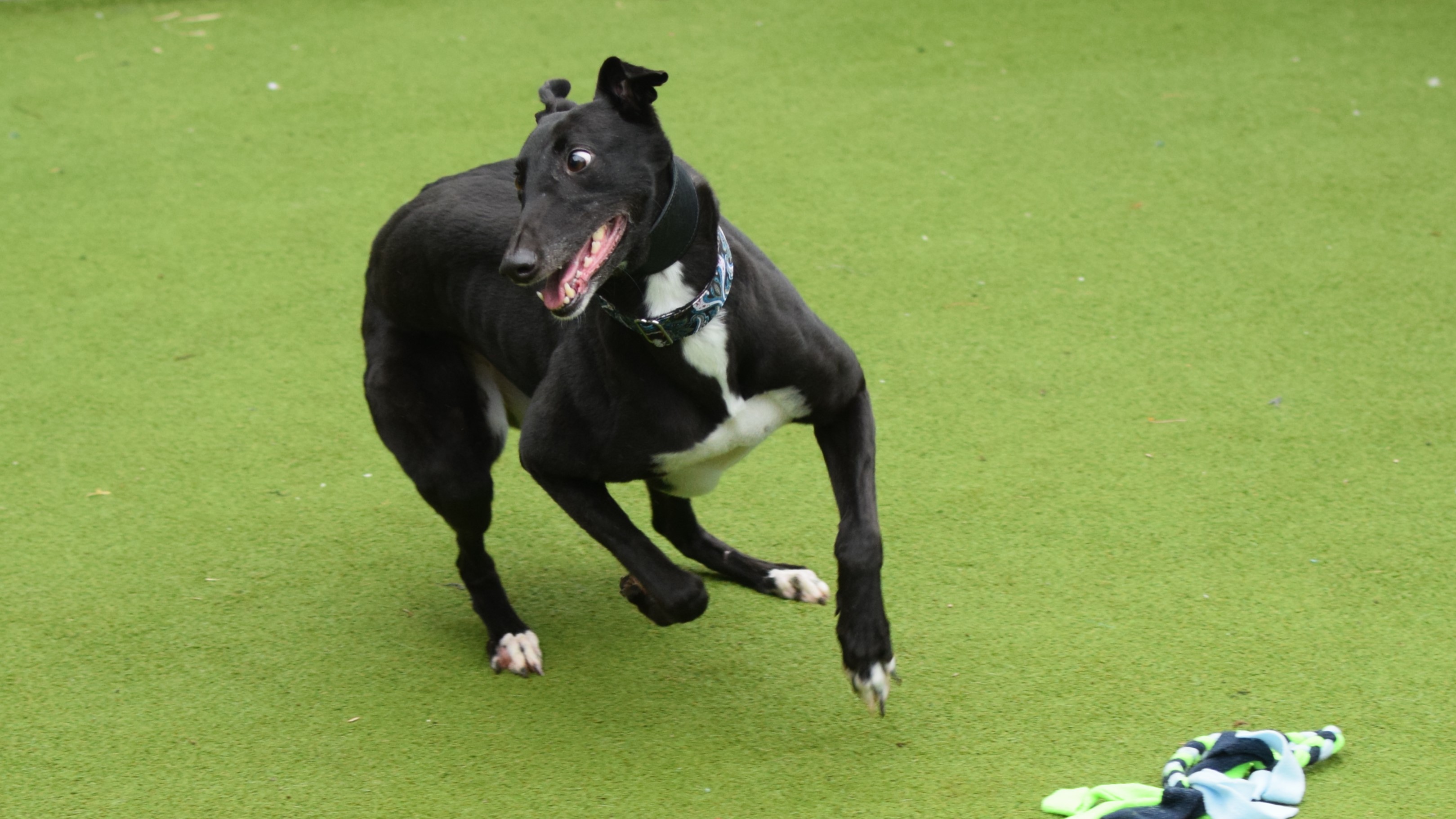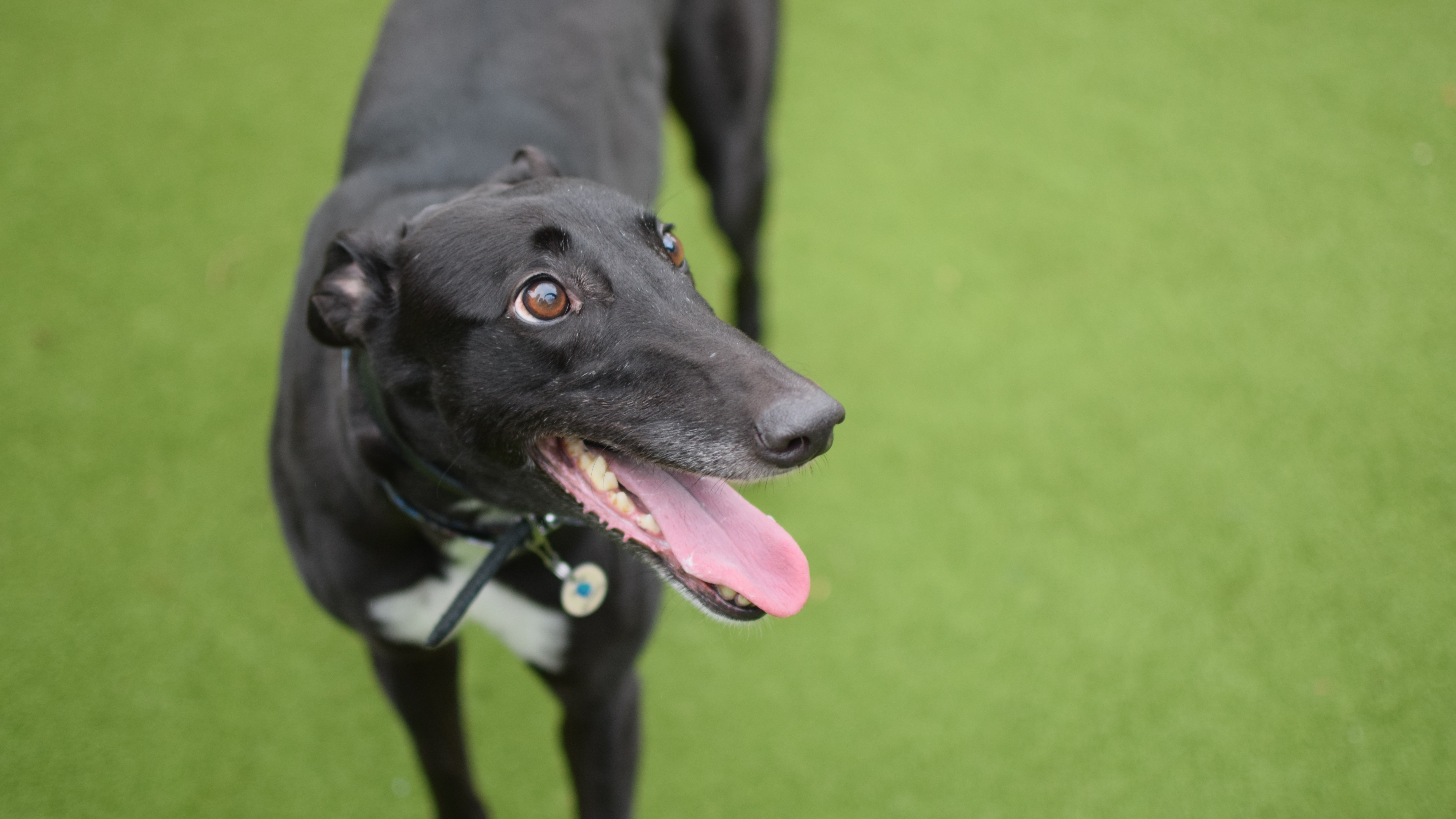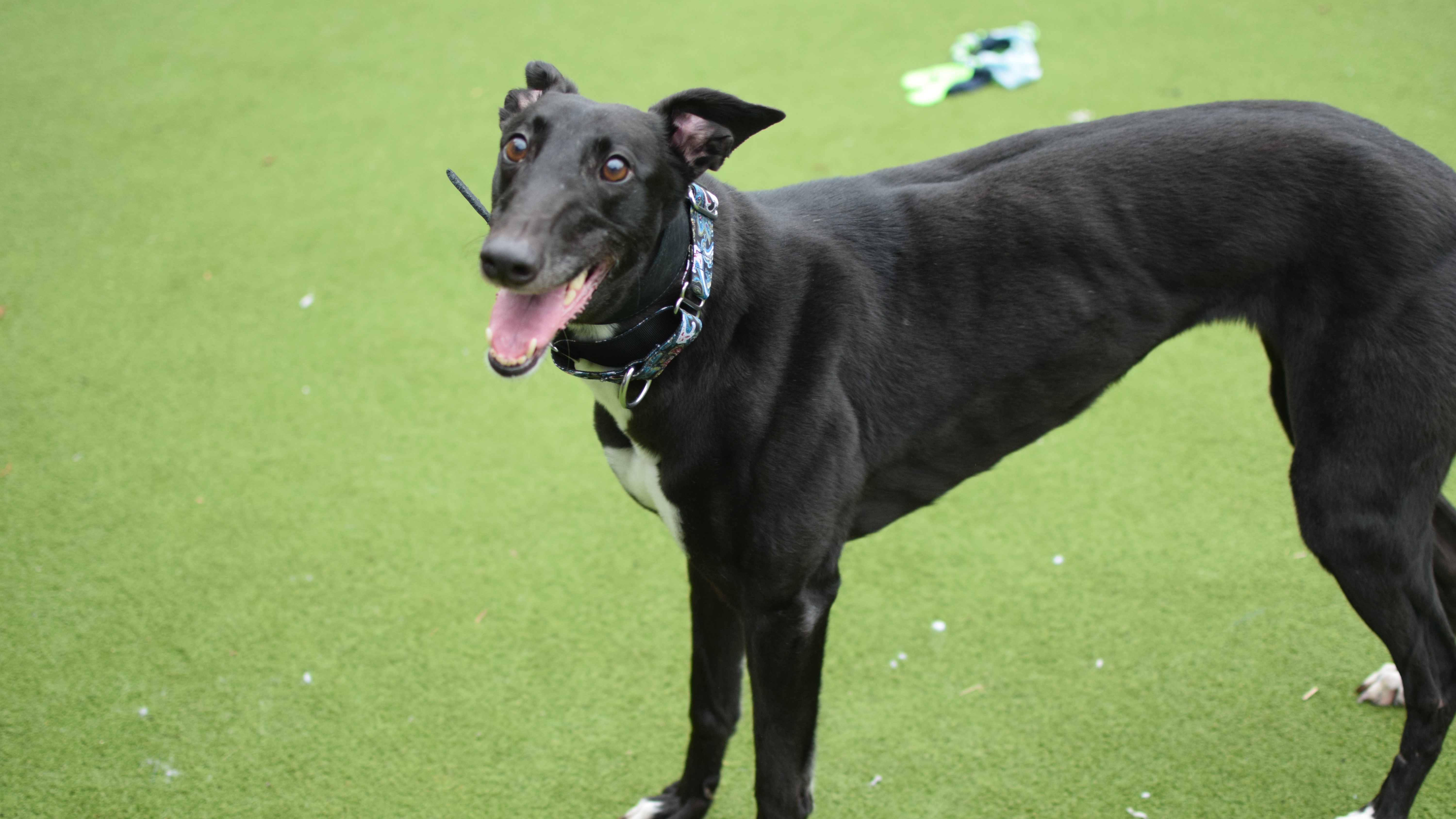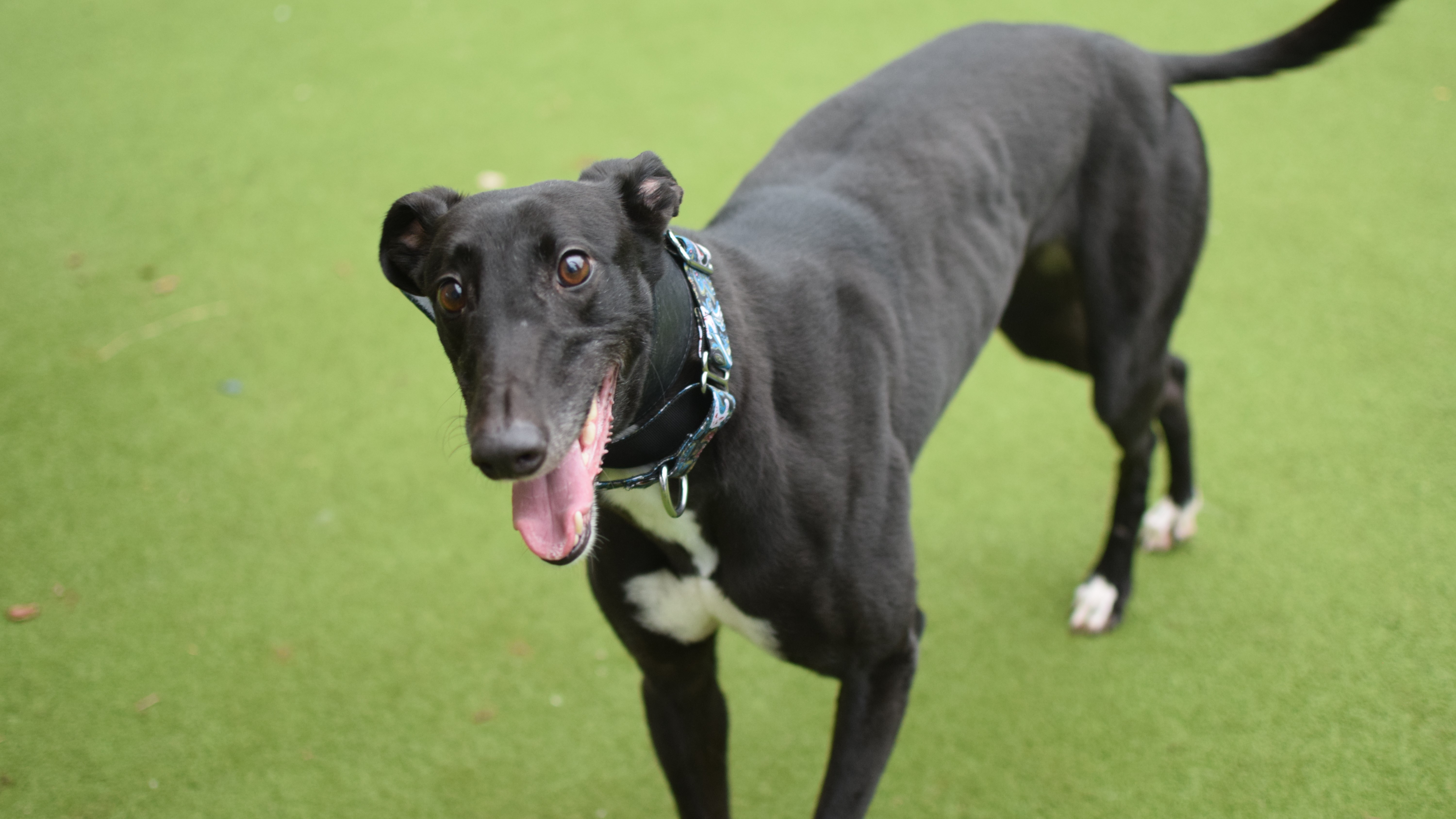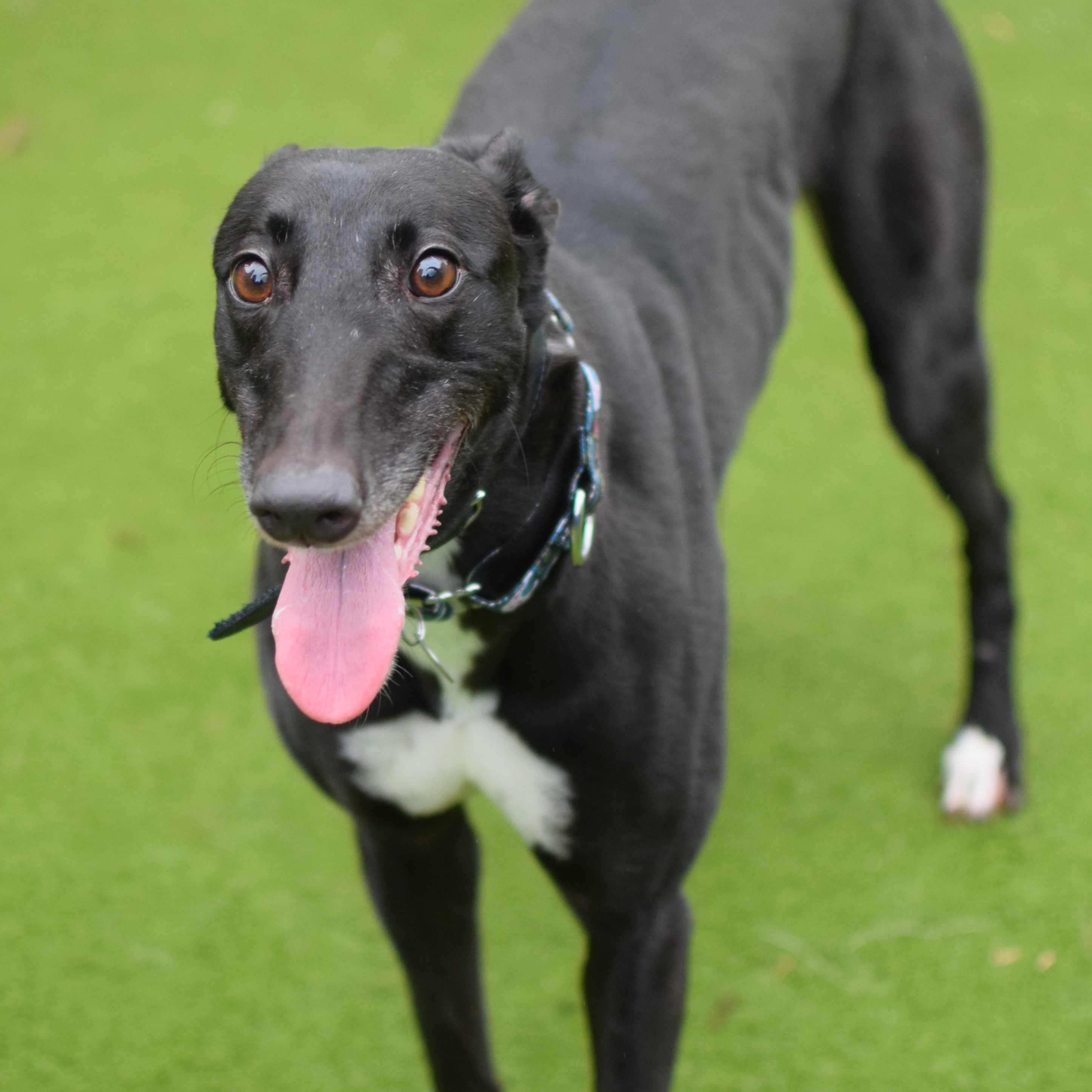 Due to her racing background, Dolly will need to be muzzled and on lead at all times when out and about. She would really like to have her own garden to sniff & run around in.