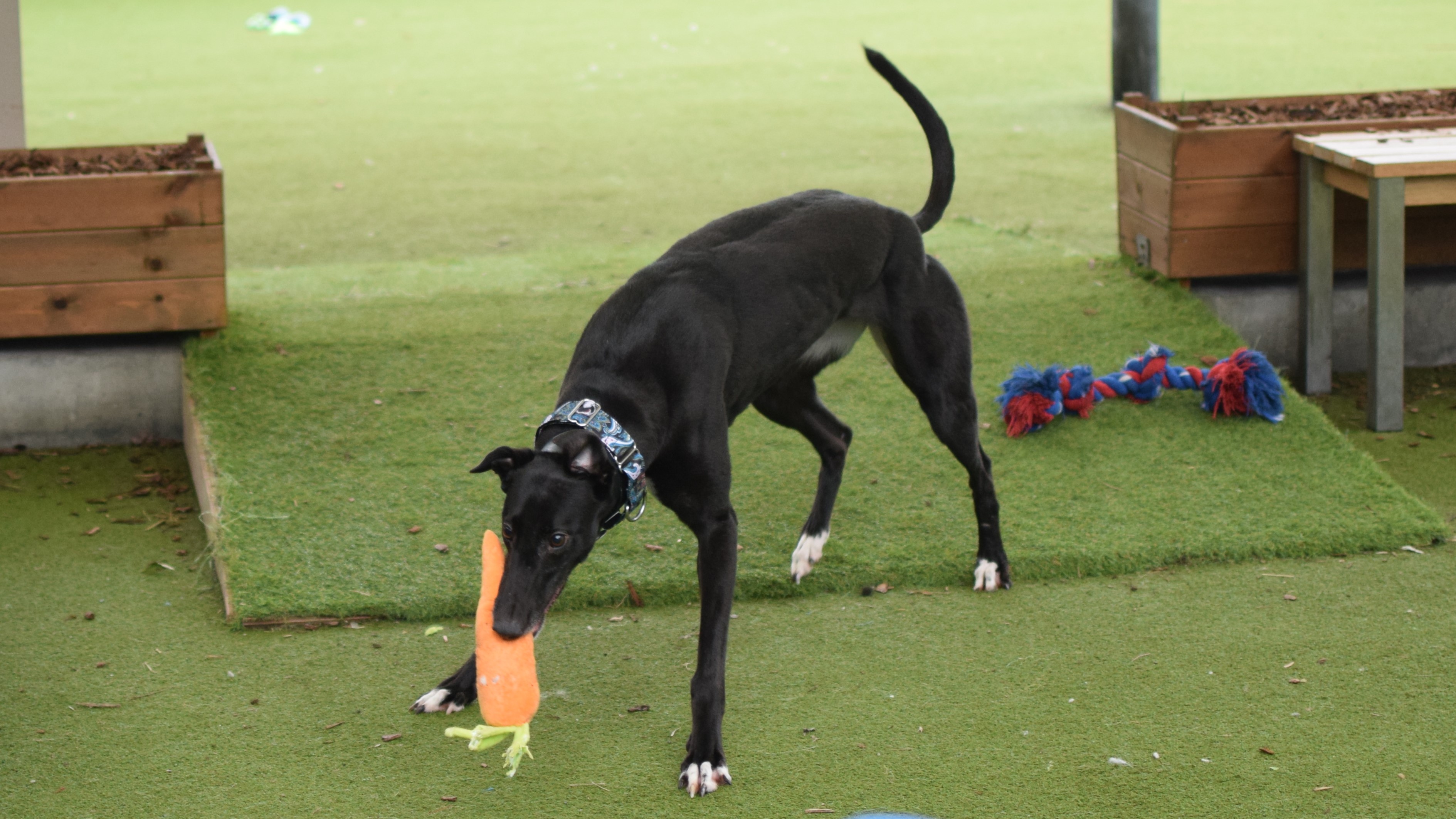 Whilst she does enjoy a walk with her fellow long-legged steady greyhound friends, Dolly has been a little overwhelmed when meeting smaller playful dogs, is unsure what to do and will need ongoing socialising with calm steady matches that can build up her confidence. She is looking to be the only spoilt dog in the home.
