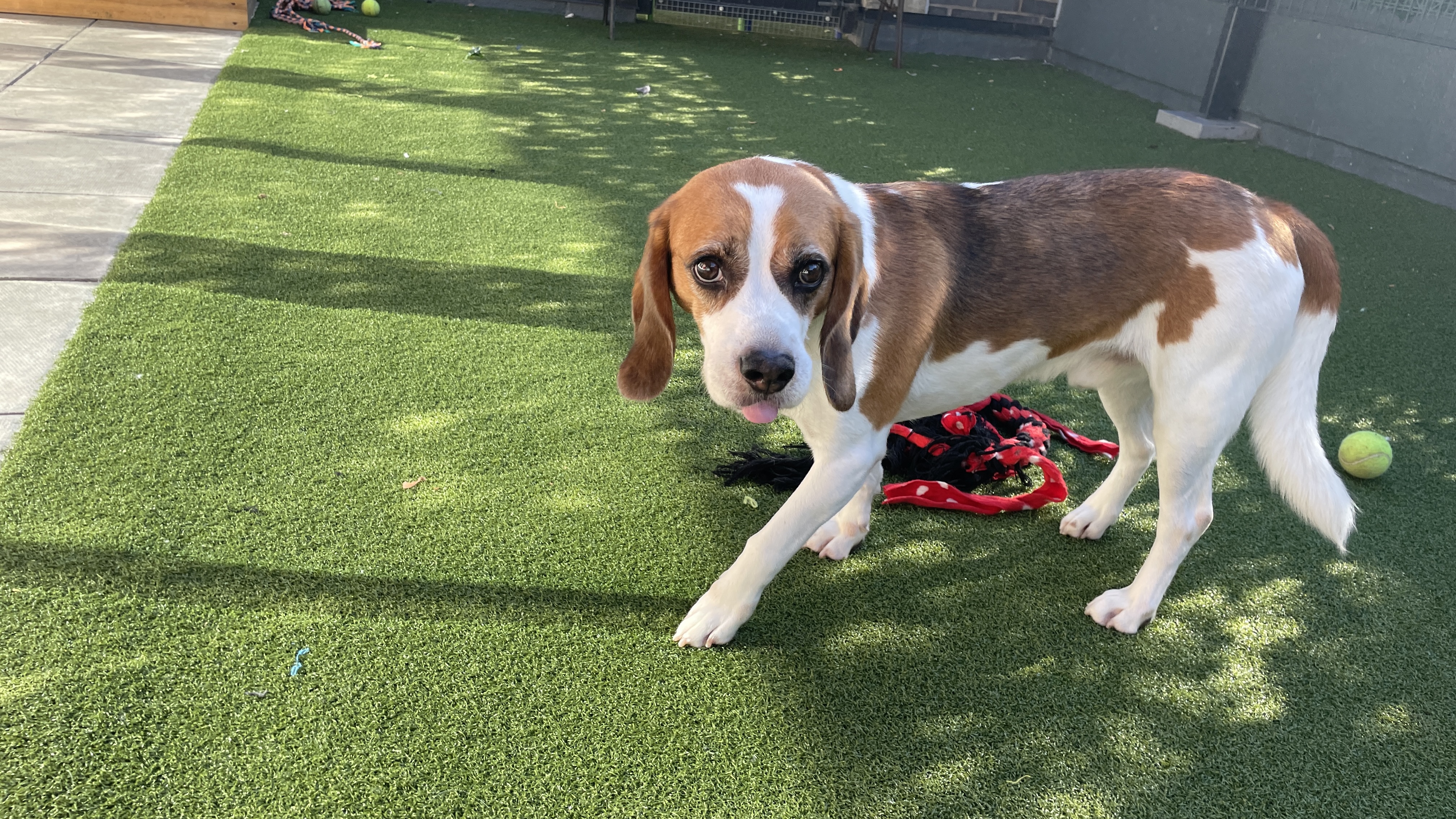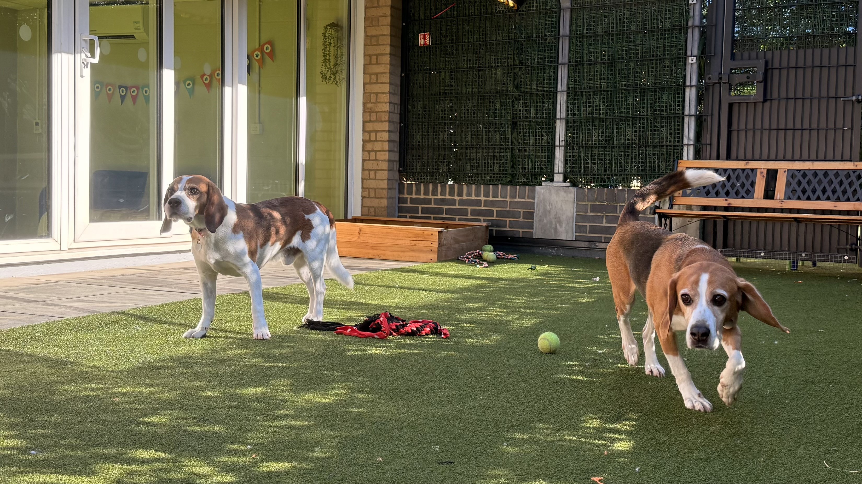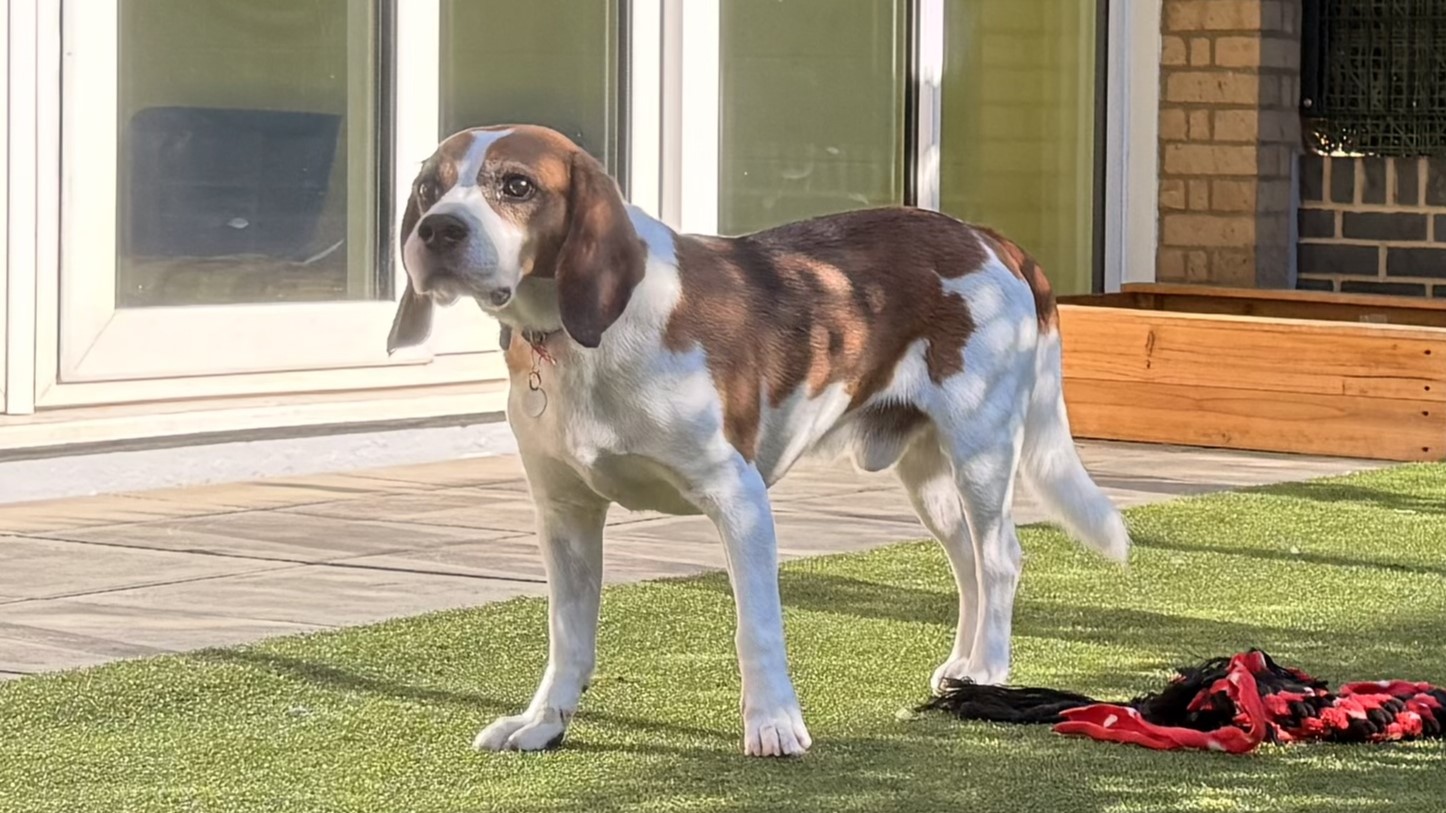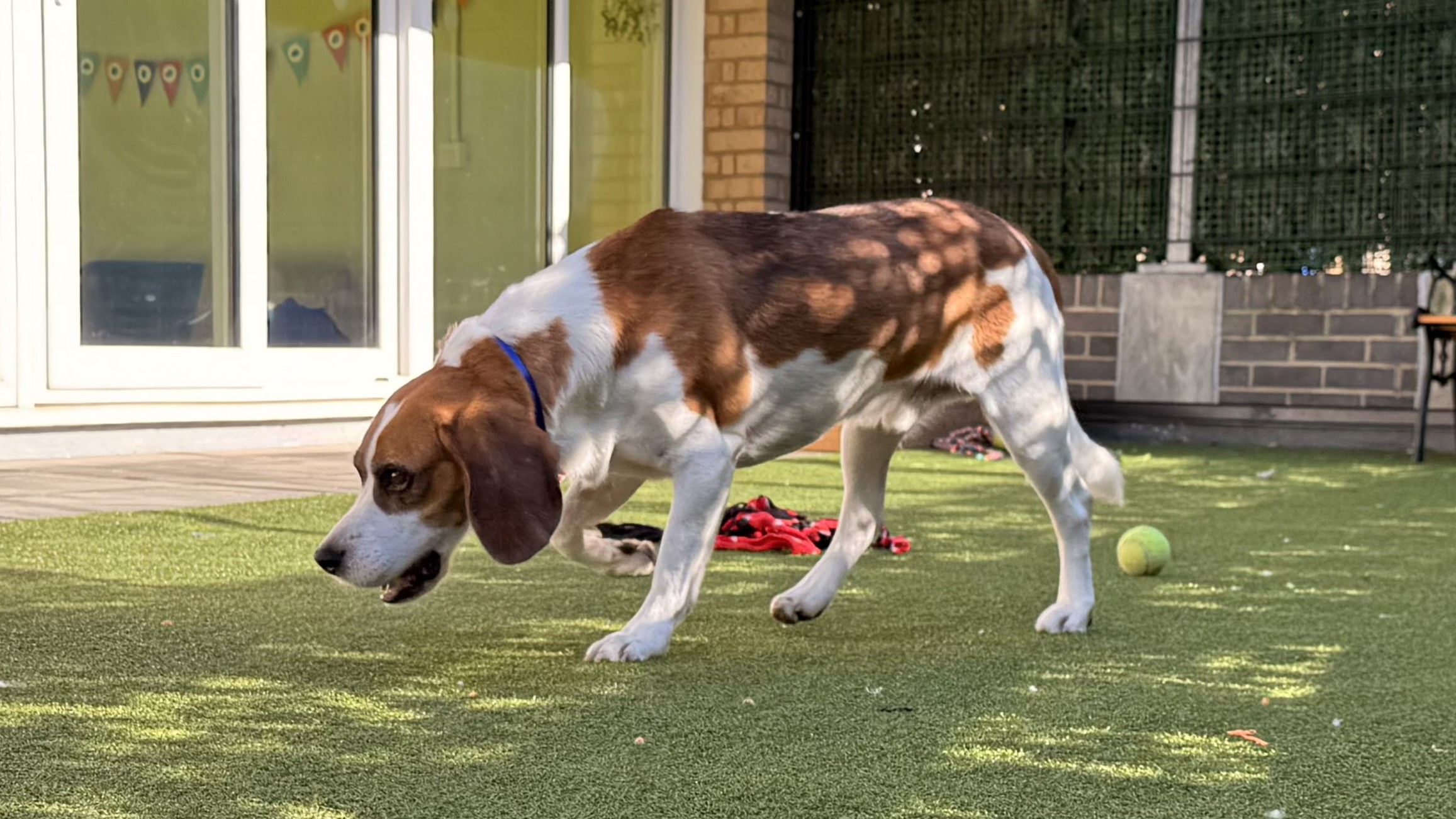 Donald arrived with 6 other Beagles and has been kennelled with one while onsite, he definitely gains confidence when around other dogs so we are looking to either rehoming them together, or he could go home with another dog that is the right match for him. It will be important that the resident dog is a steady and stable role model for him that Donald will benefit from.