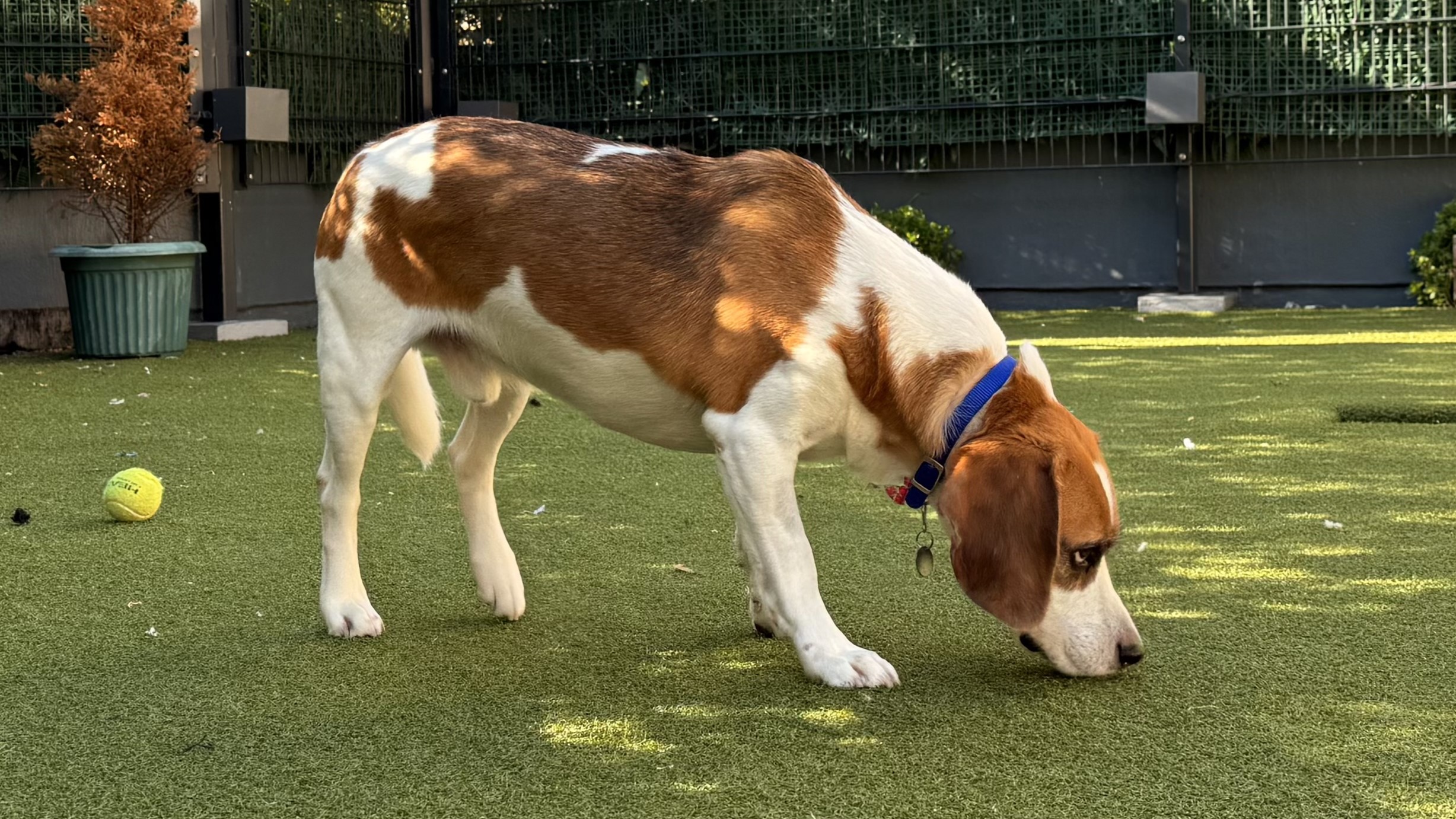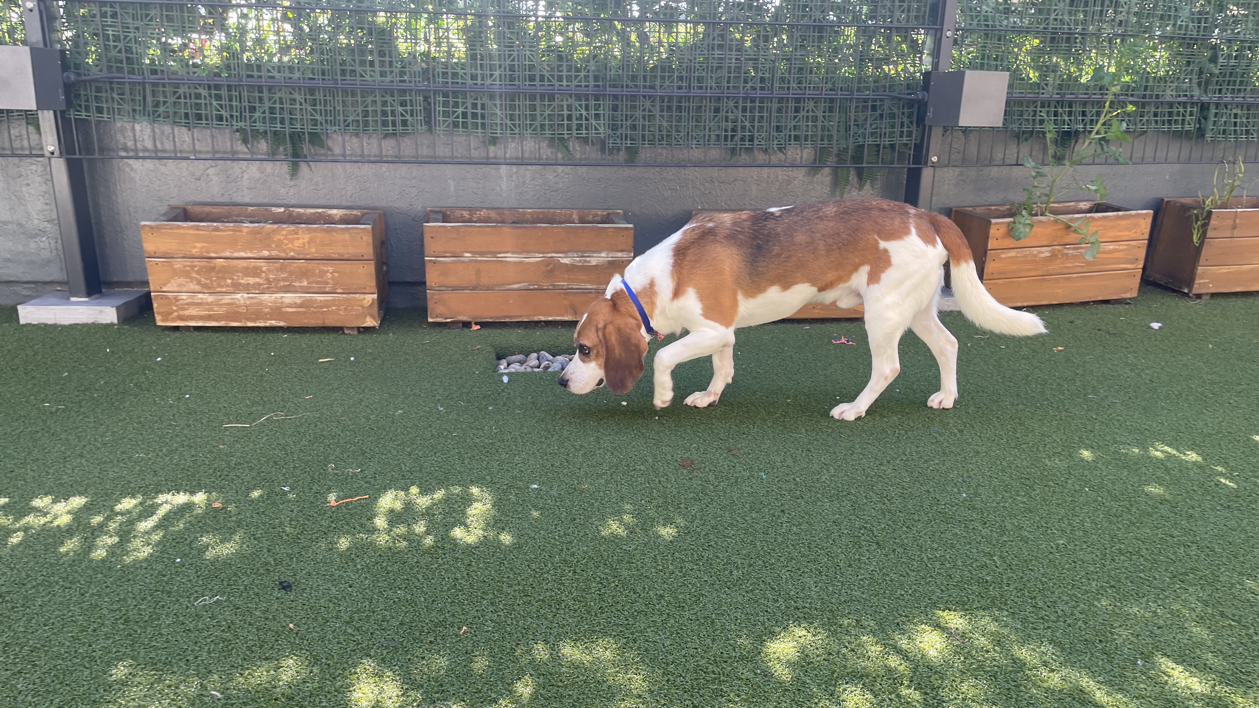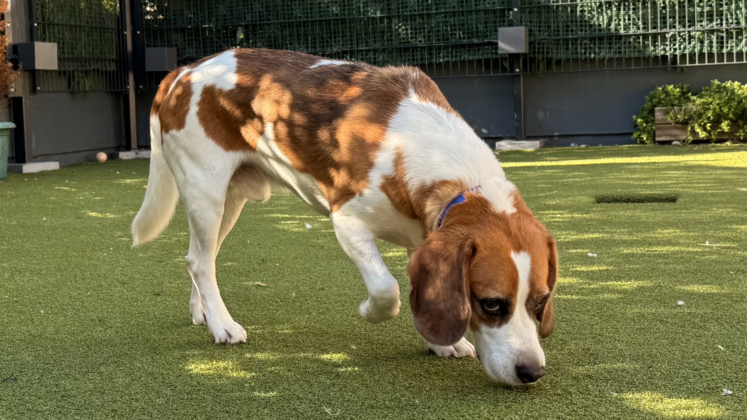 Donald arrived with 6 other Beagles and has been kennelled with one while onsite, he definitely gains confidence when around other dogs so we are looking to either rehoming them together, or he could go home with another dog that is the right match for him. It will be important that the resident dog is a steady and stable role model for him that Donald will benefit from.