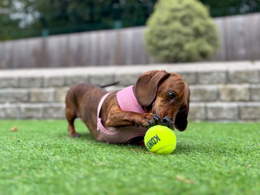 Dottie loves her toys, her favourites are tennis balls, and she also enjoys playing with soft squeaky toys. She can become over excited while playing with tennis balls and has been vocal when wanting her handlers to throw them.