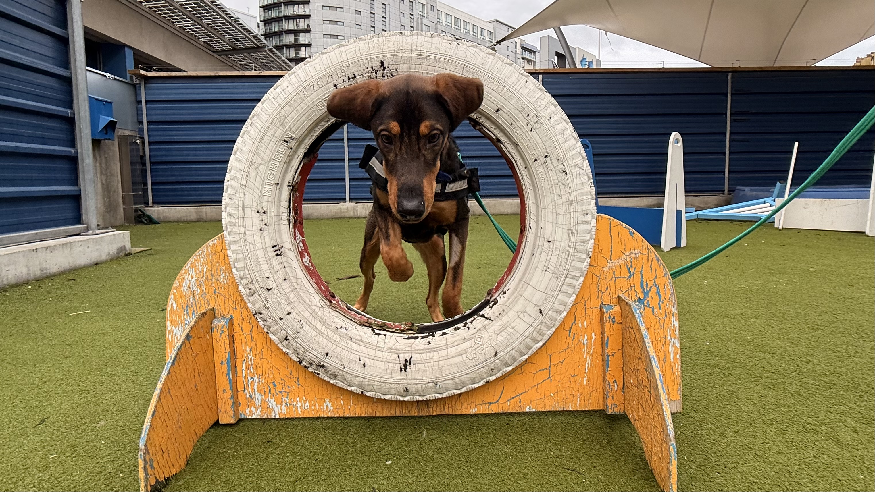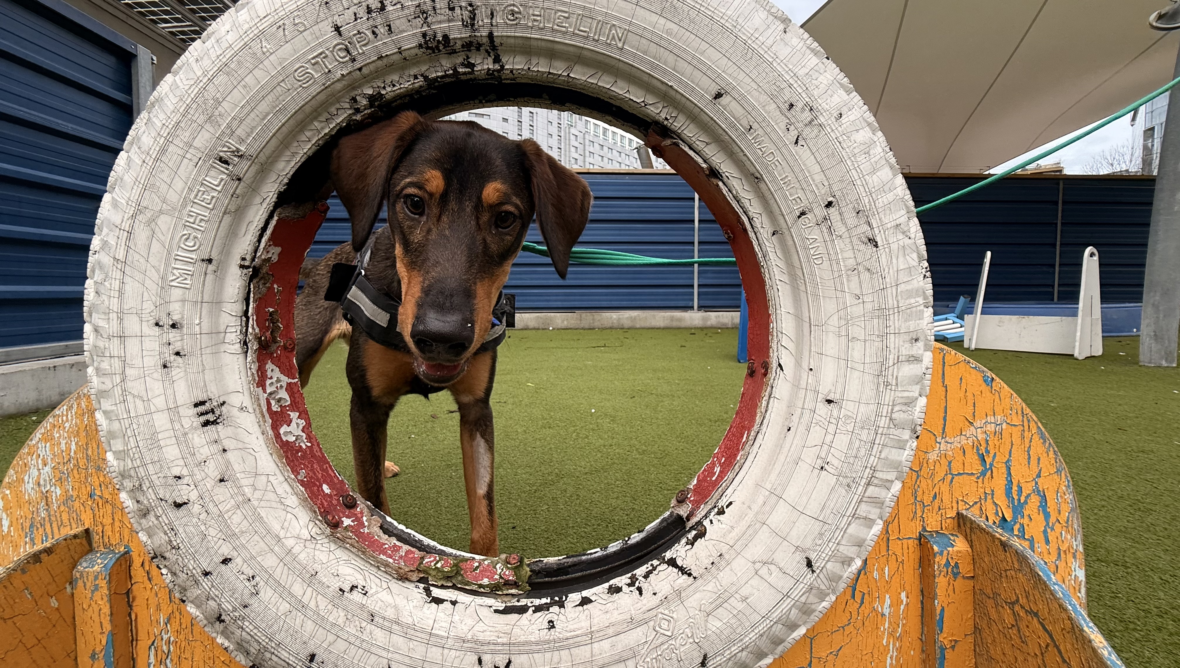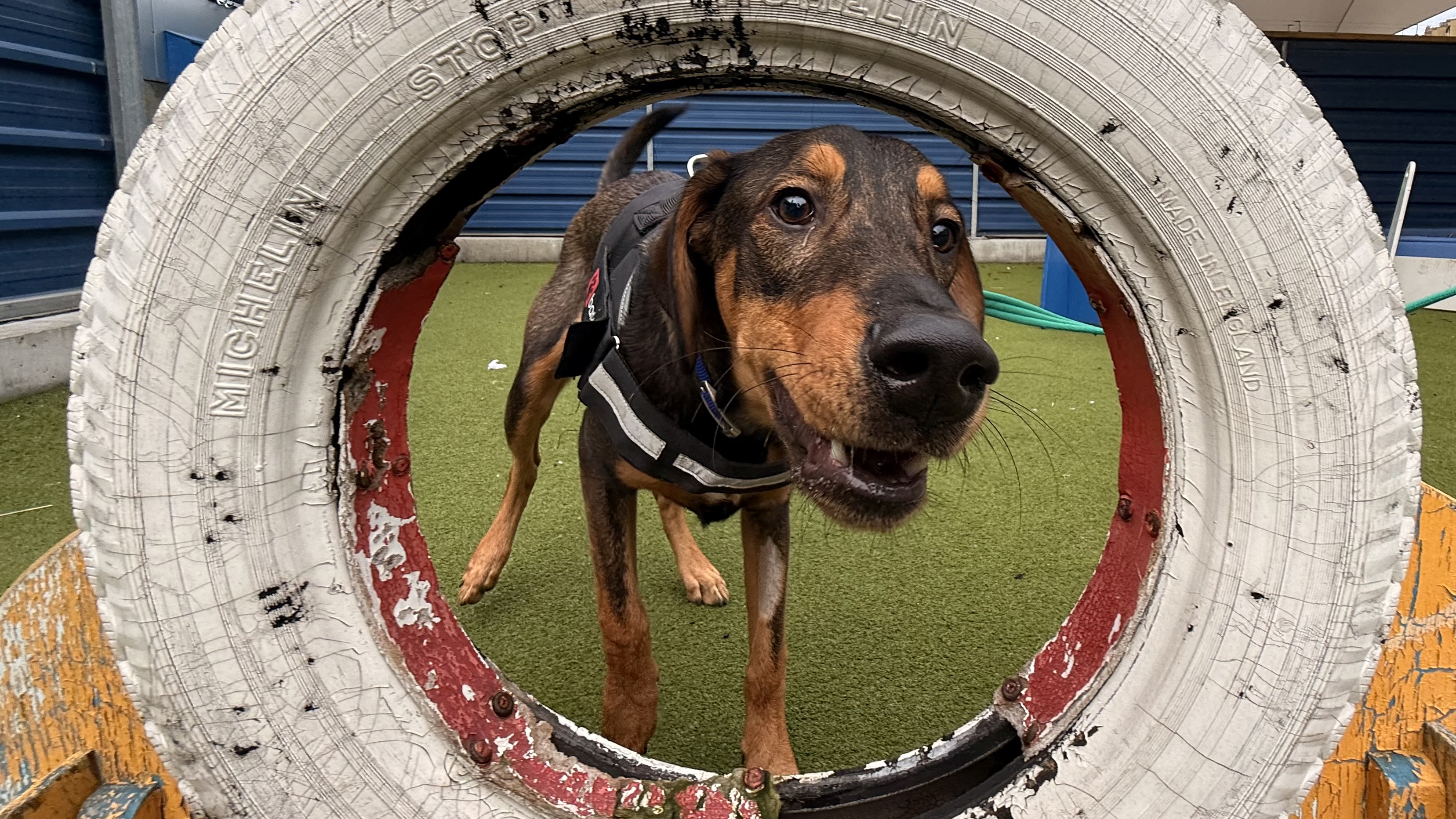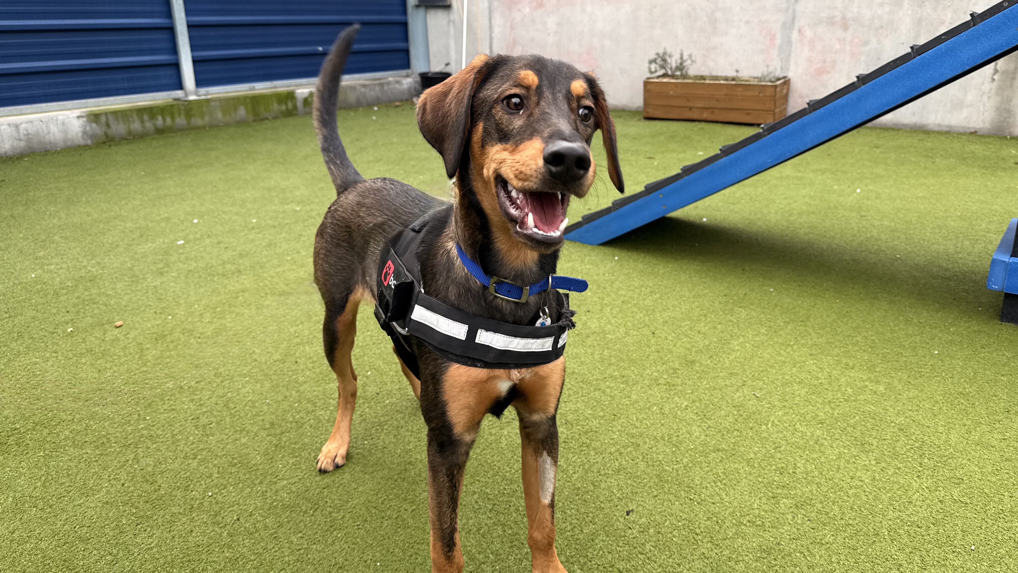 He is a little sensitive around noises and slippery surfaces and will need to have some support reassurance with new experiences, however onsite he has shown improvement with his confidence when rewarding calm movement on walks and on different flooring which will only blossom as new owners go at his own pace.