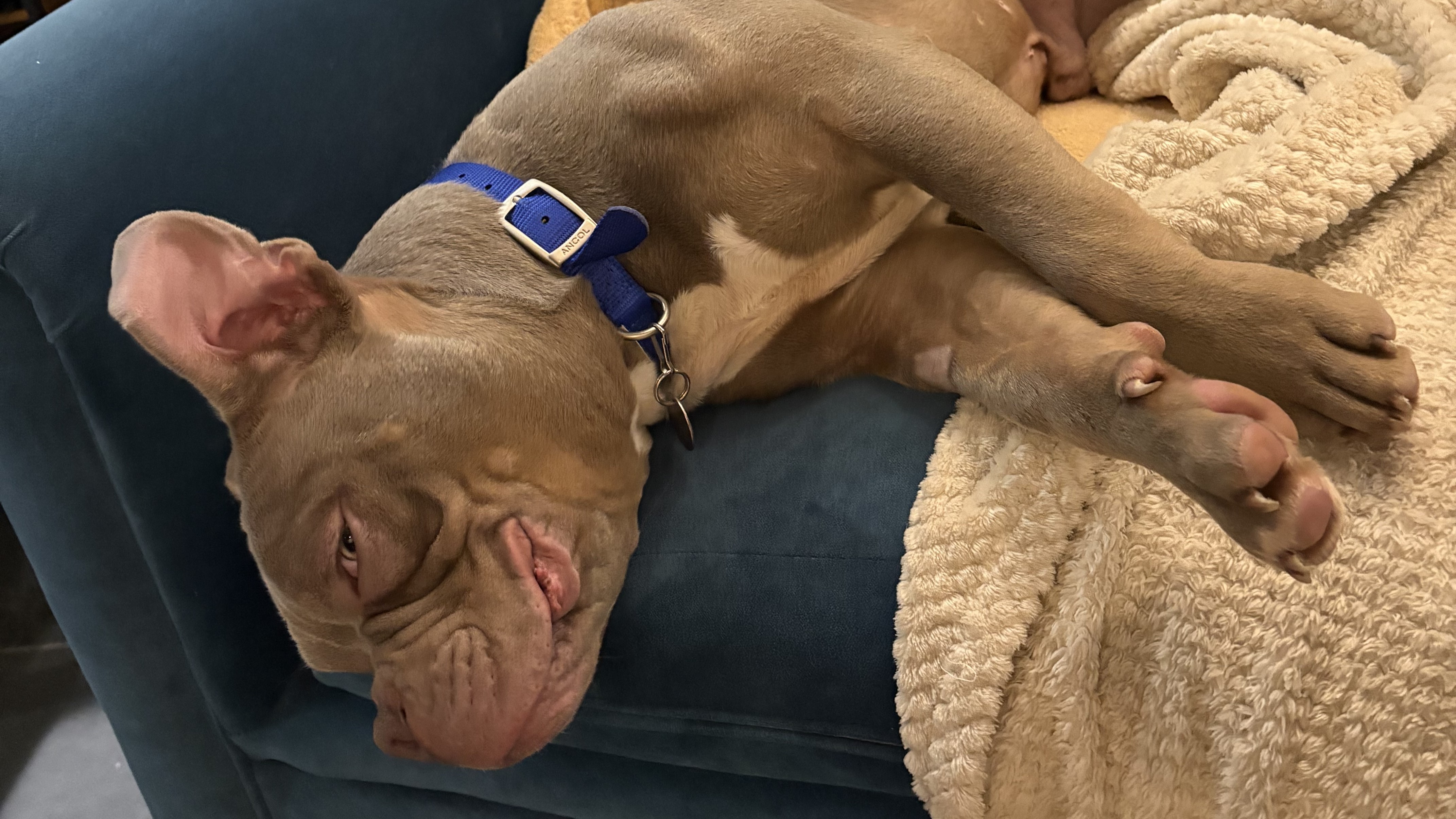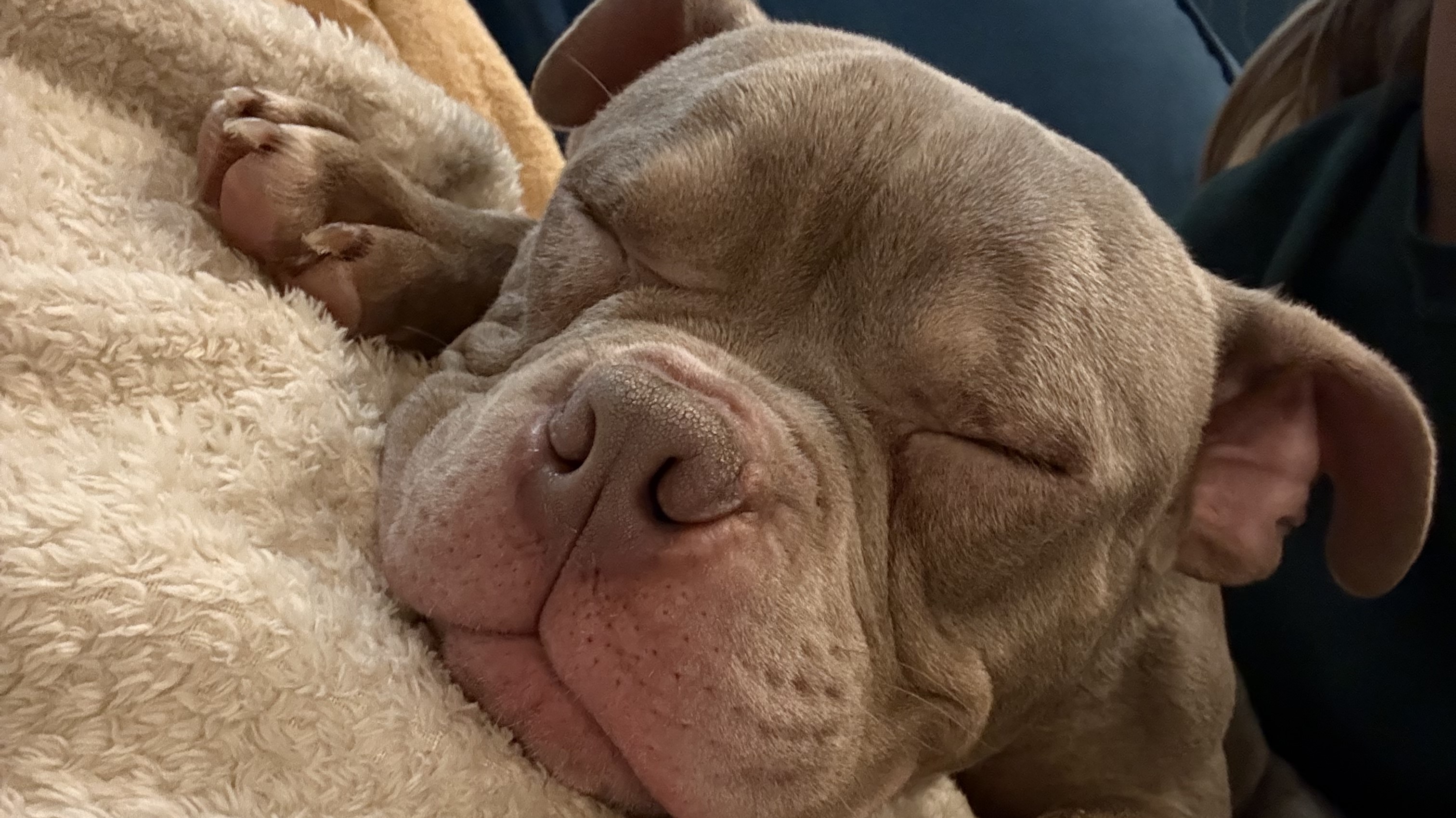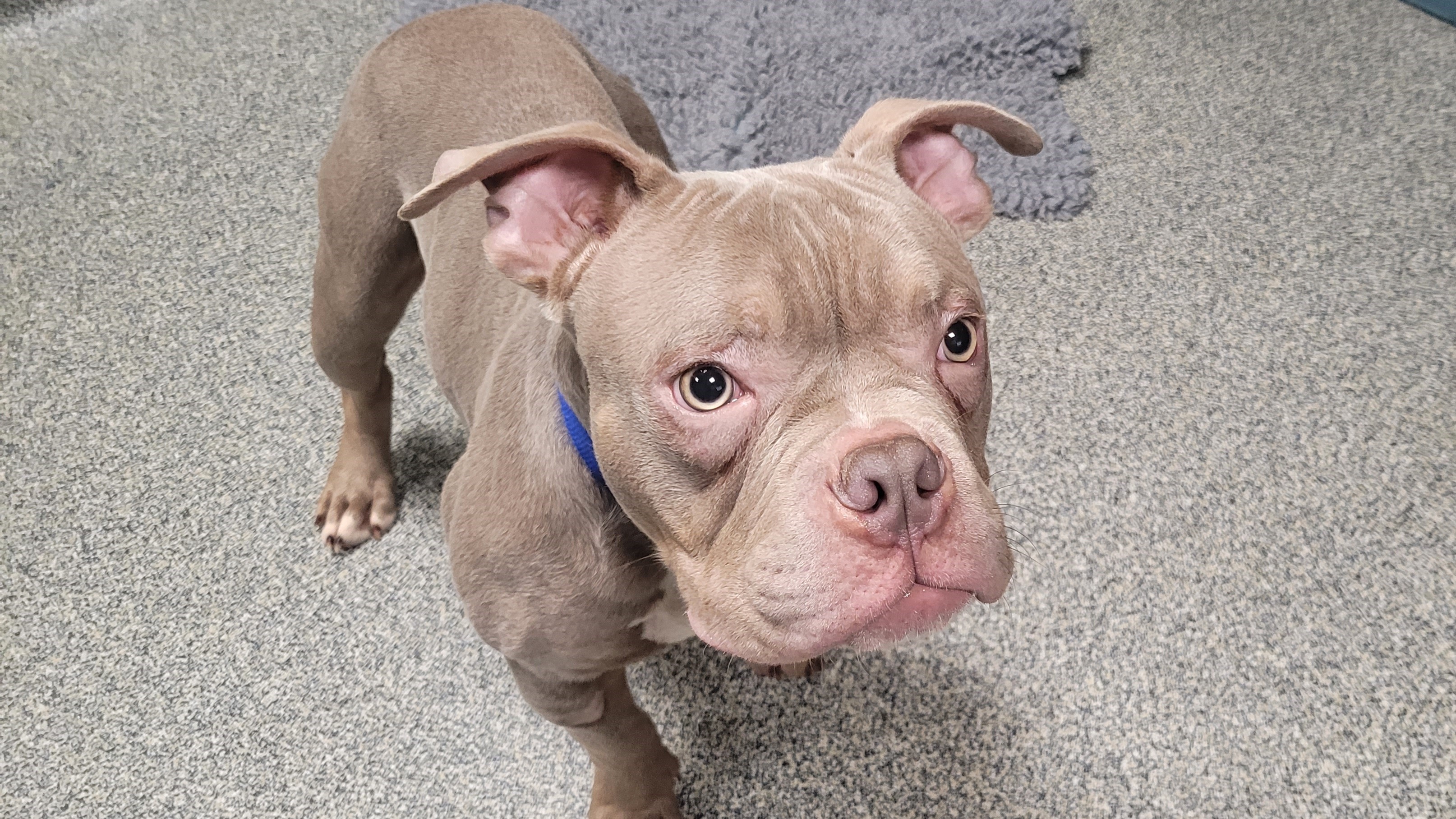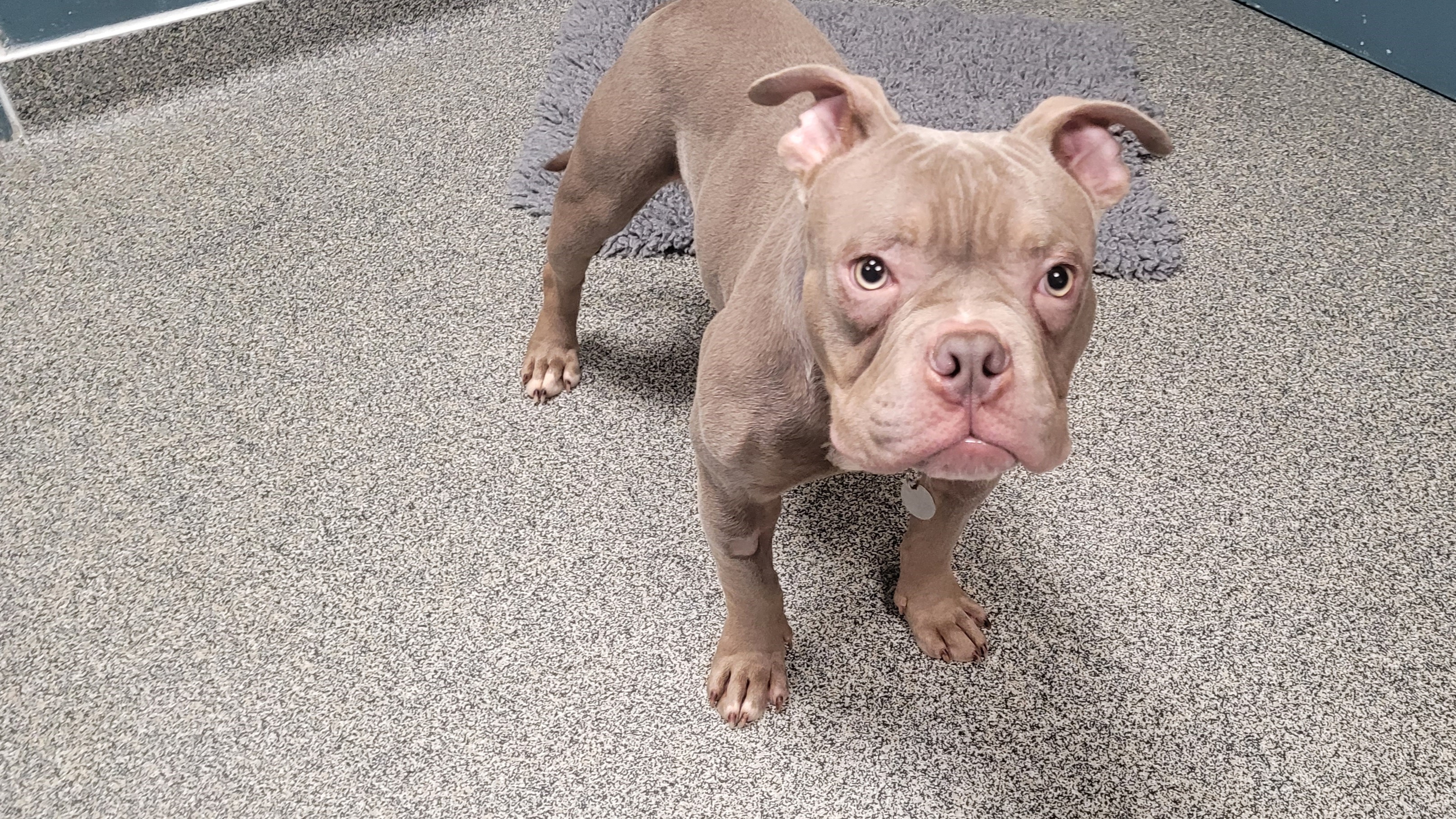 Greyson arrived on site as a stray and we unfortunately do not have any information on his history. Greyson is a sweet 8 month old pocket bully type, with a lot of love to give. He has been friendly with everyone he has met on site and loves to snuggle up for a fuss, especially head rubs.