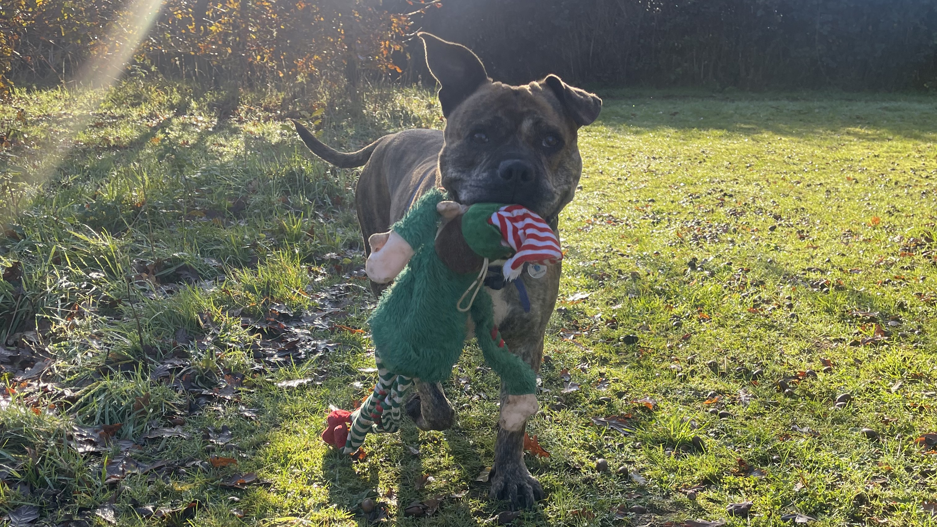 Sweet staffie Harley is an excitable girl who loves playing with her toys and zooming around our paddocks.