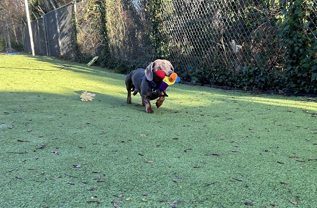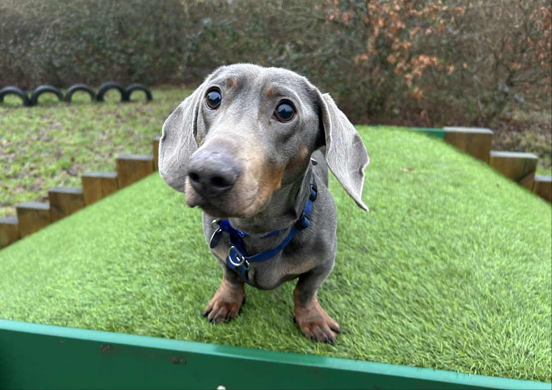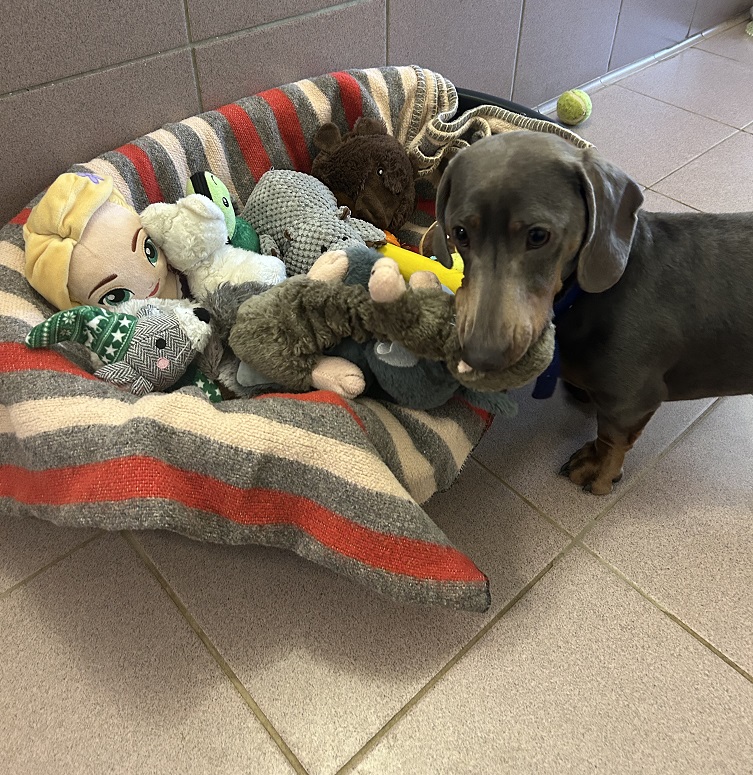 Meet our wonderful sausage, Louie! Louie is a bright and handsome boy who absolutely loves his toys - especially lots of soft cuddly toys, which he will carry around his kennel and play with for hours. Once he trusts you, Louie is an affectionate dog who enjoys accompanying his handlers on rambles around our fields and paddocks and can often be found zooming up and down our paddocks parading his toys around!