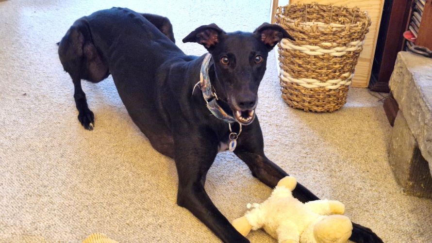 Likes many Greyhounds, some of her favourite things are relaxing on her bed, leaning on people for a fuss and treats - chicken really is the way to her heart. Maggie's not yet mastered the art of playing with toys but with some encouragement once she's settled she might enjoy a chase game with a fluffy toy.
