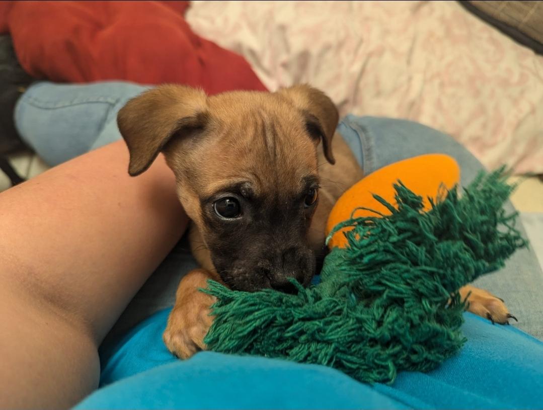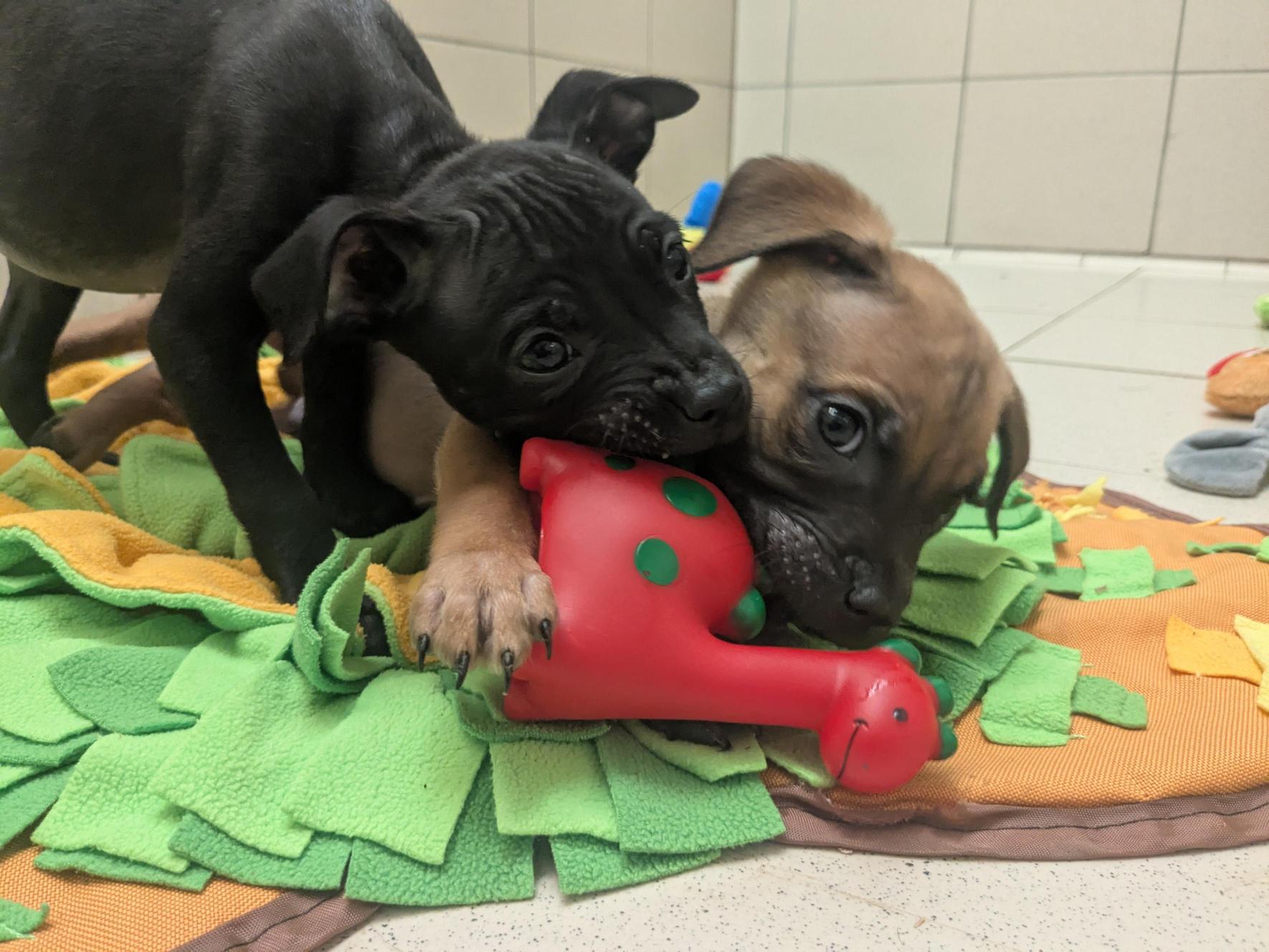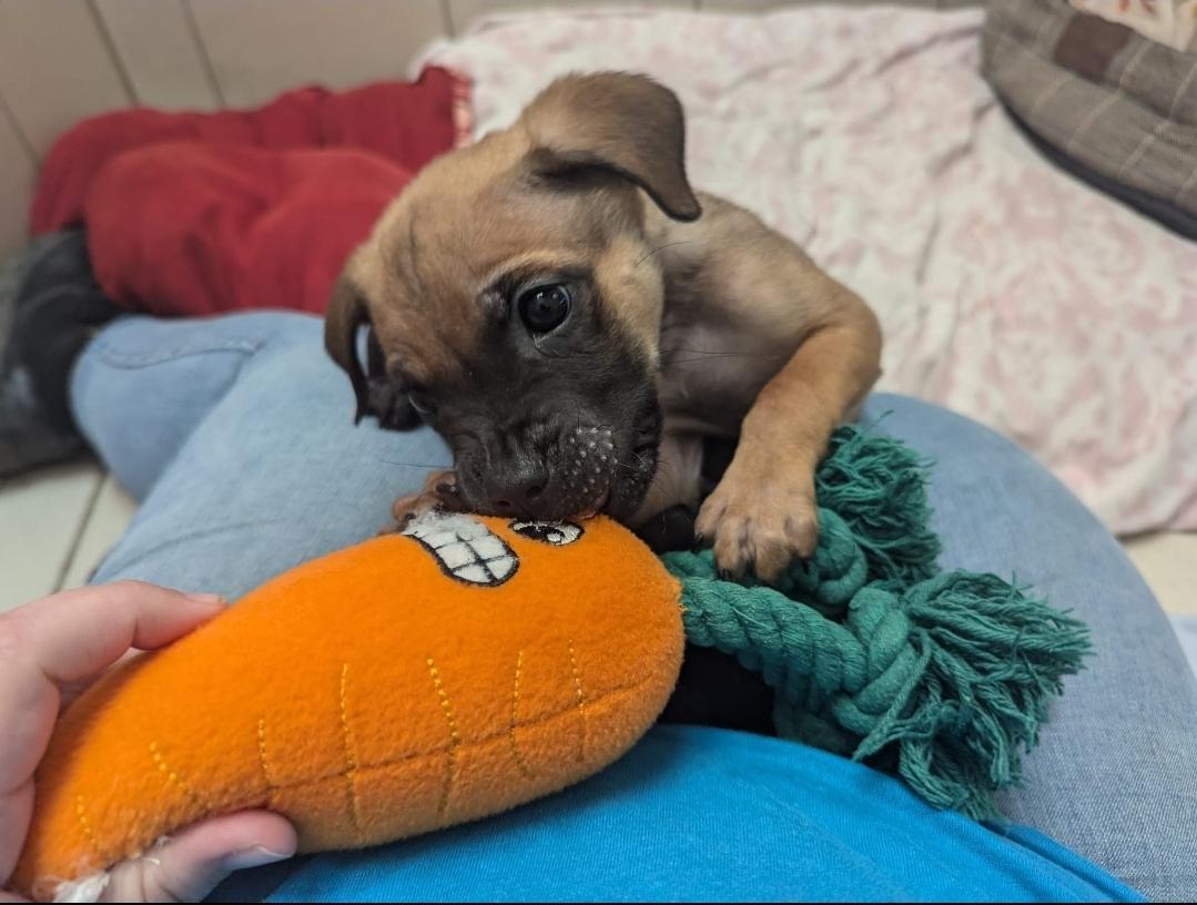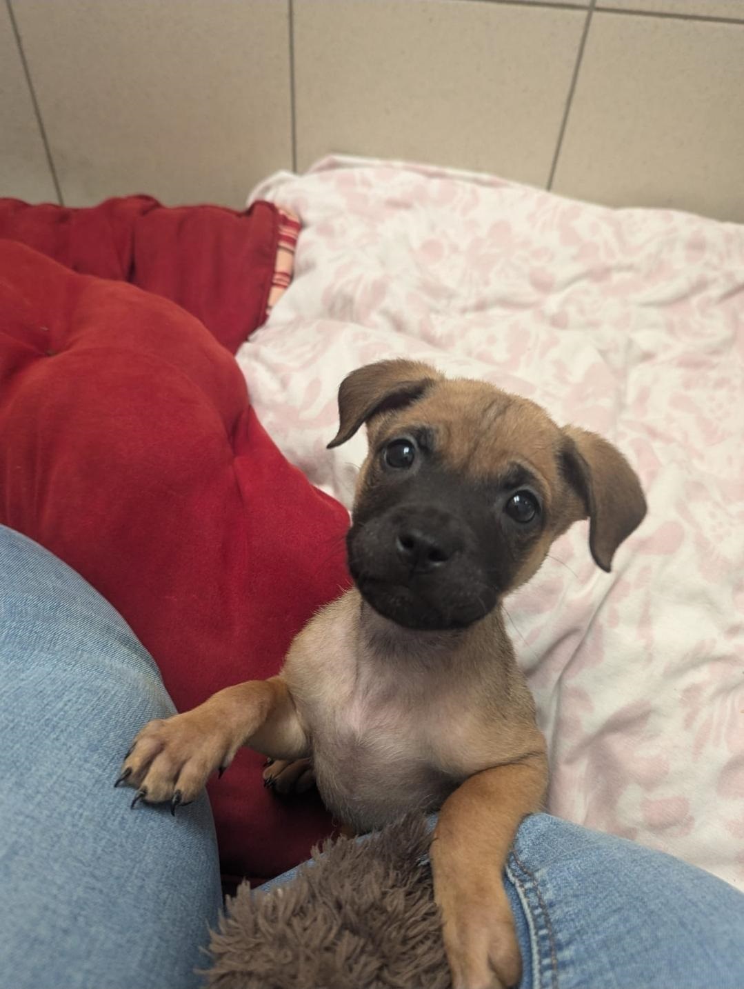 Mikey is just a little baby and has not had much exposure to the outside world. He will need his new owners to help him through his socialising and basic training at his own pace as to not overwhelm his little brain! He is a staffie cross and although we are unsure about his dad, we expect him to grow into a big boy, potentially reaching 30kgs or more.