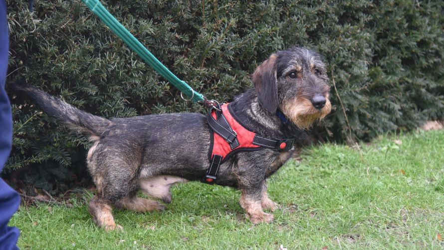 Due to his breed, he would enjoy going on steady walks but would not be suited to longer hikes. New owners should do some research into Dachshunds if they are not familiar with their breed traits.
