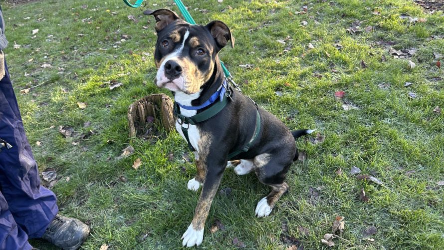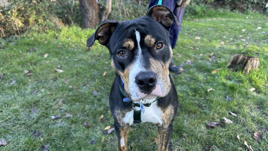 Moose is a sensitive and gentle Staffordshire Bull Terrier cross who is currently based at Battersea Old Windsor.