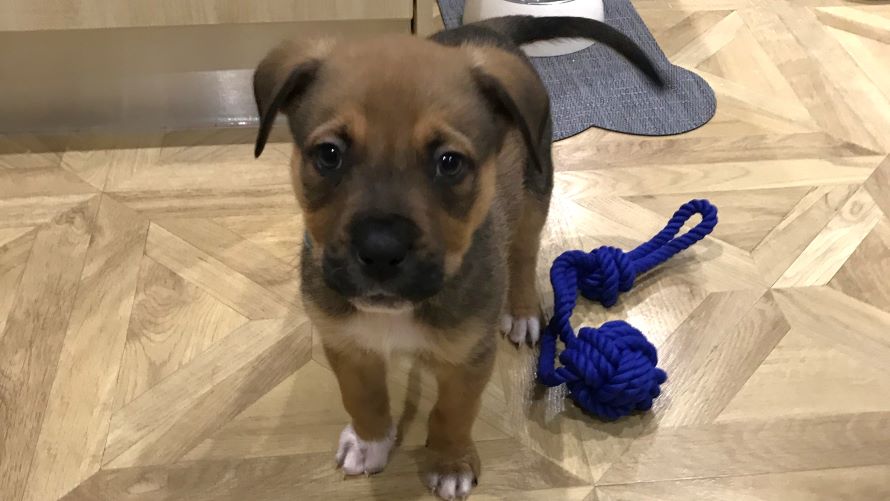 Moss is a lively young crossbreed puppy who enjoys playing with his toys and running around.