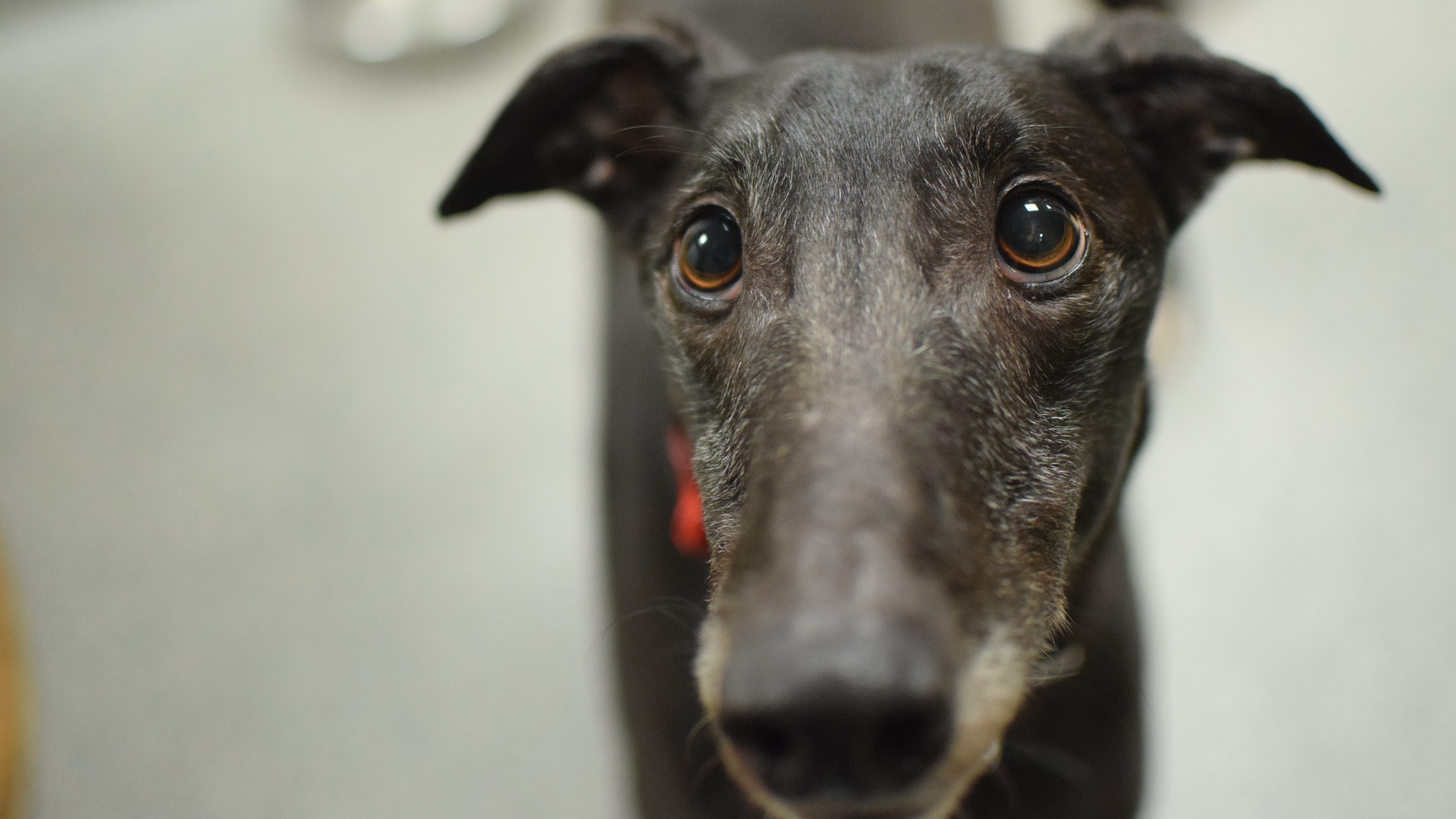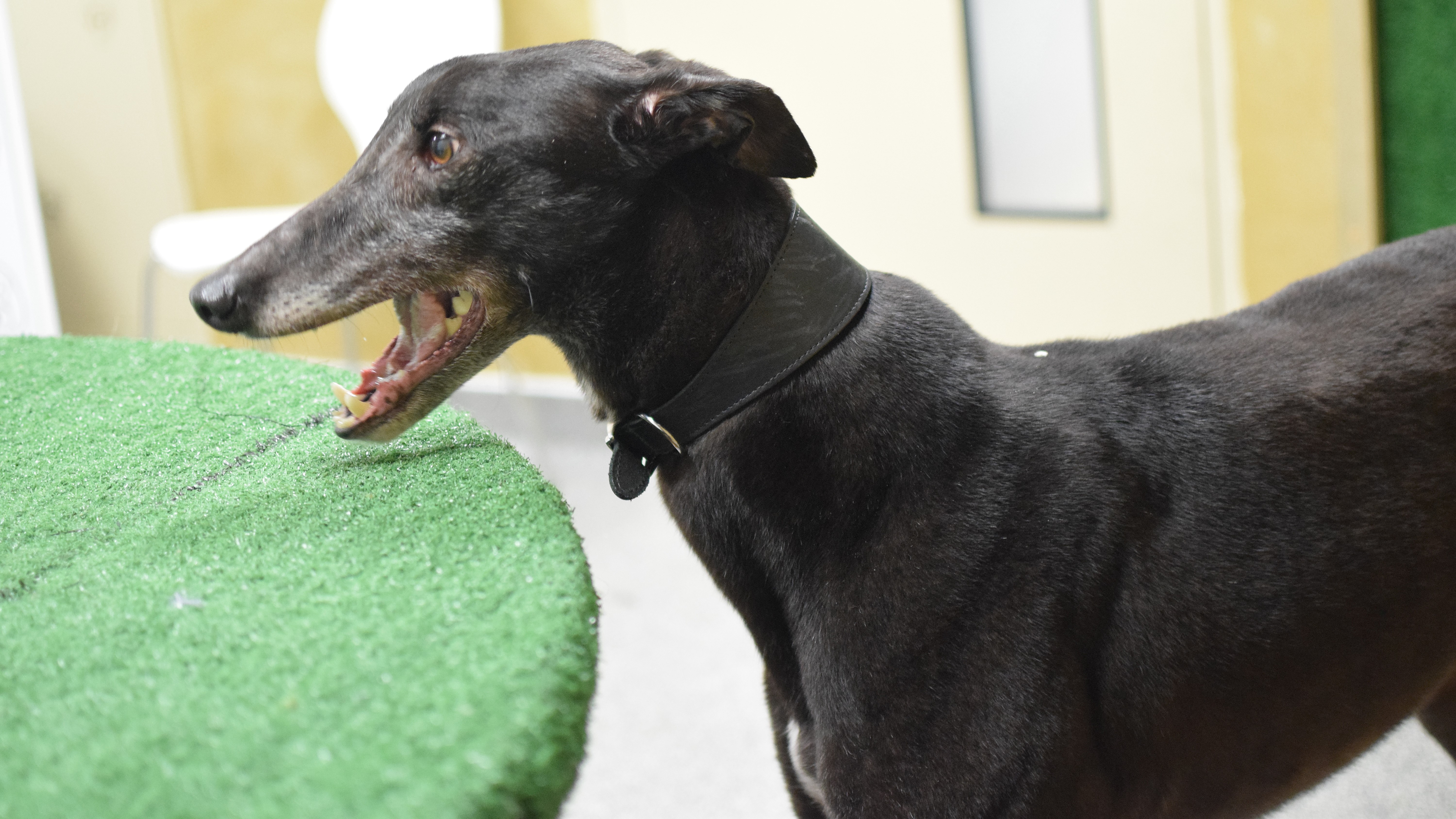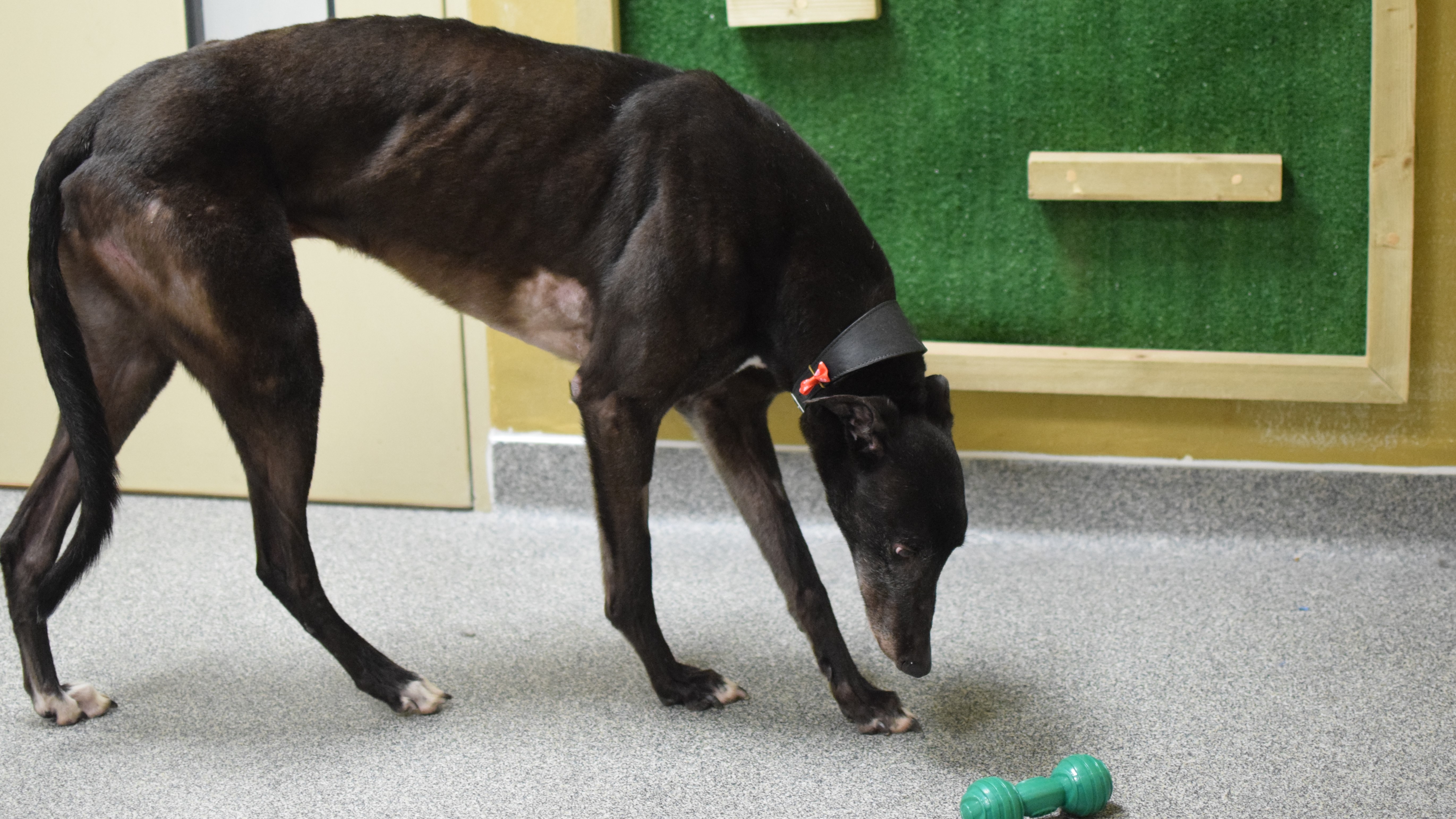 Due to his racing background, he’ll need to stay on lead and muzzled when out on walks. As he will need to be kept on lead in public spaces, he is looking for a new home that has a private secure garden for him to have some off lead space to potter around in, or new owners who may be willing to hire a private field so that he can stretch his legs.