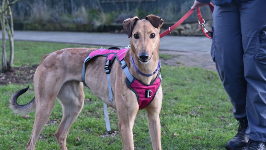 Rosie is a Greyhound who is very enthusiastic about life and not shy about showing it.