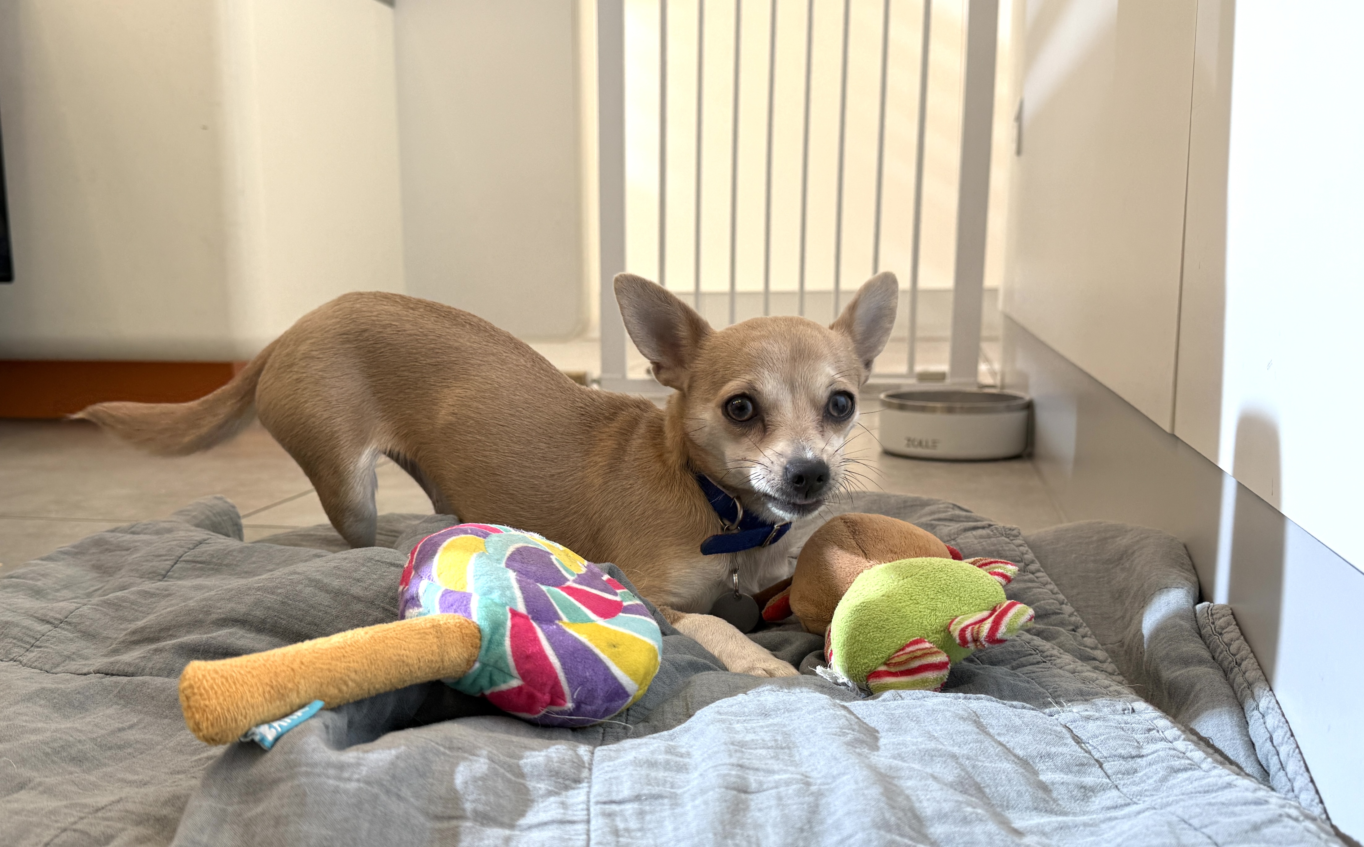 She can still have a worried nature at times, she also was worried when meeting dogs and would tend to avoid them especially the larger dogs, but she had a few doggy friends in her foster home which are smaller and calm dogs.