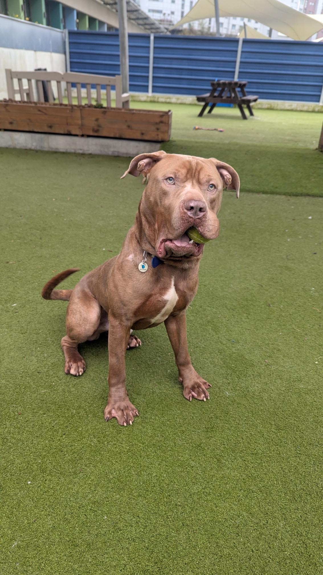 Since coming to us, he's shown to be a very friendly boy that loves being in the company of his people. He's shown to have a slight obsession for tennis balls so new owners will need to manage this in his new home to ensure he doesn't ingest anything!