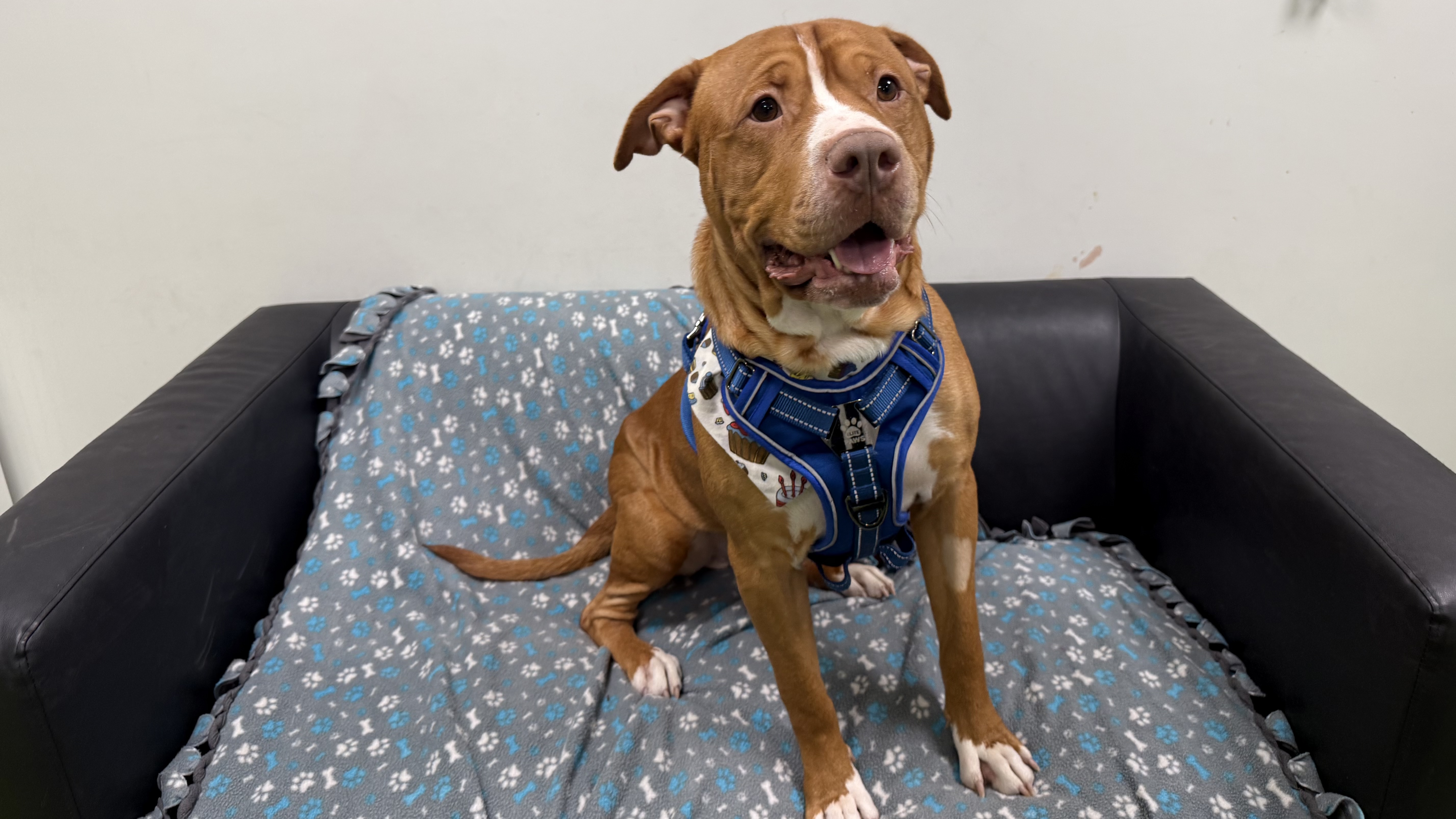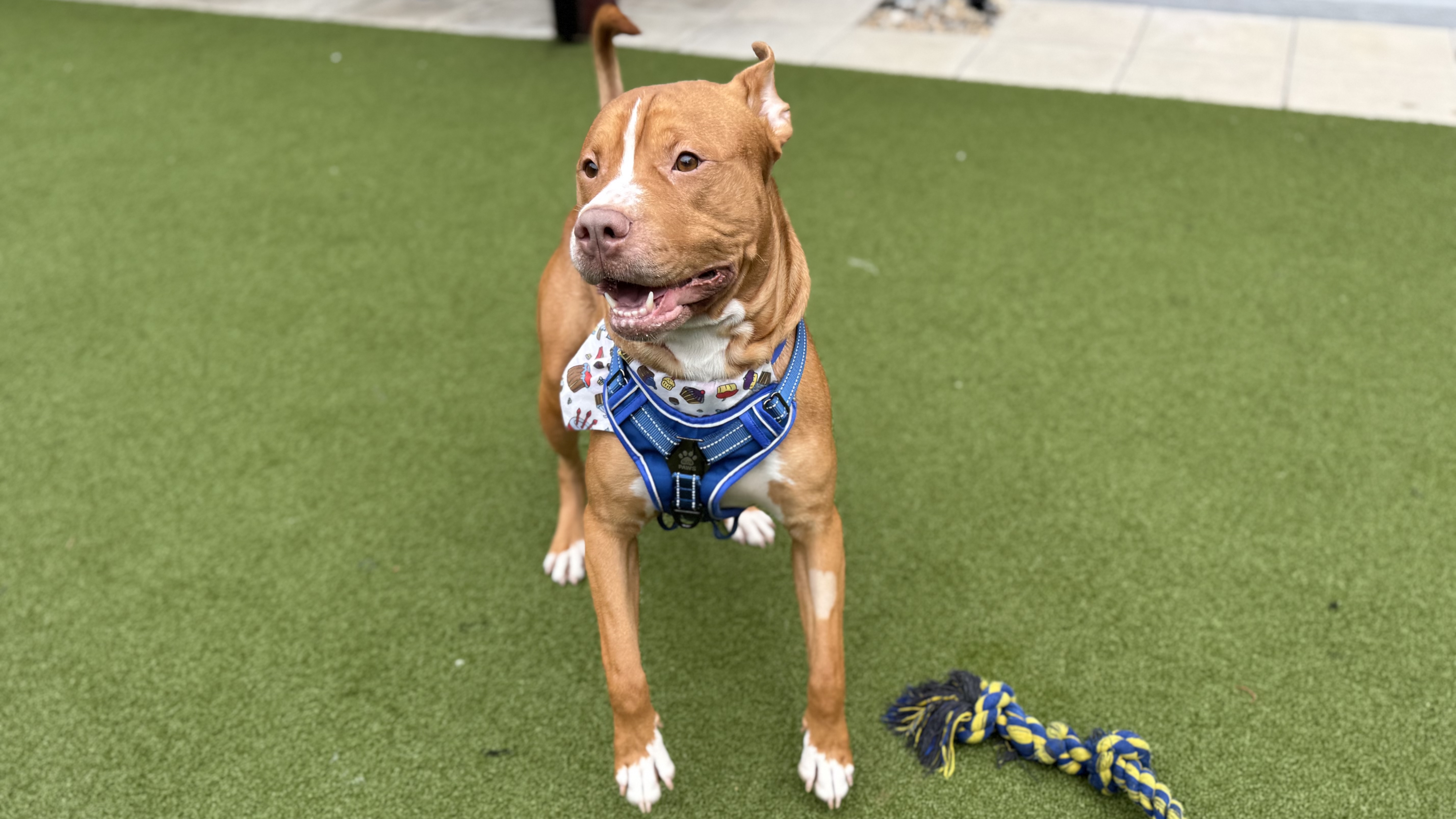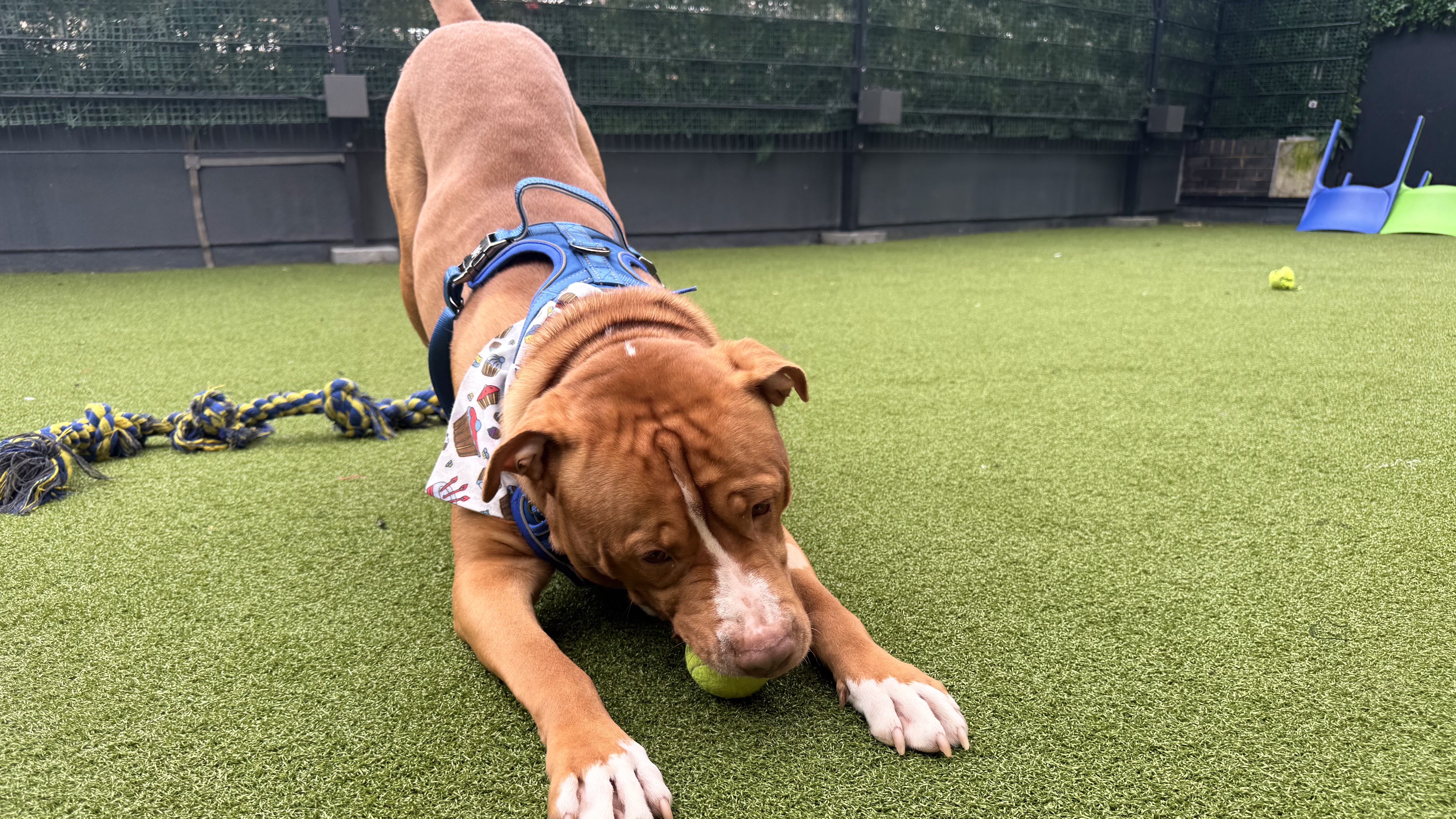 Since arriving at Battersea, Tucker has shown the same loving and affectionate character but with the added bonus of being the calmest bully on the block, who wants nothing more than to cuddle up with his favourite people and his favourite toy.