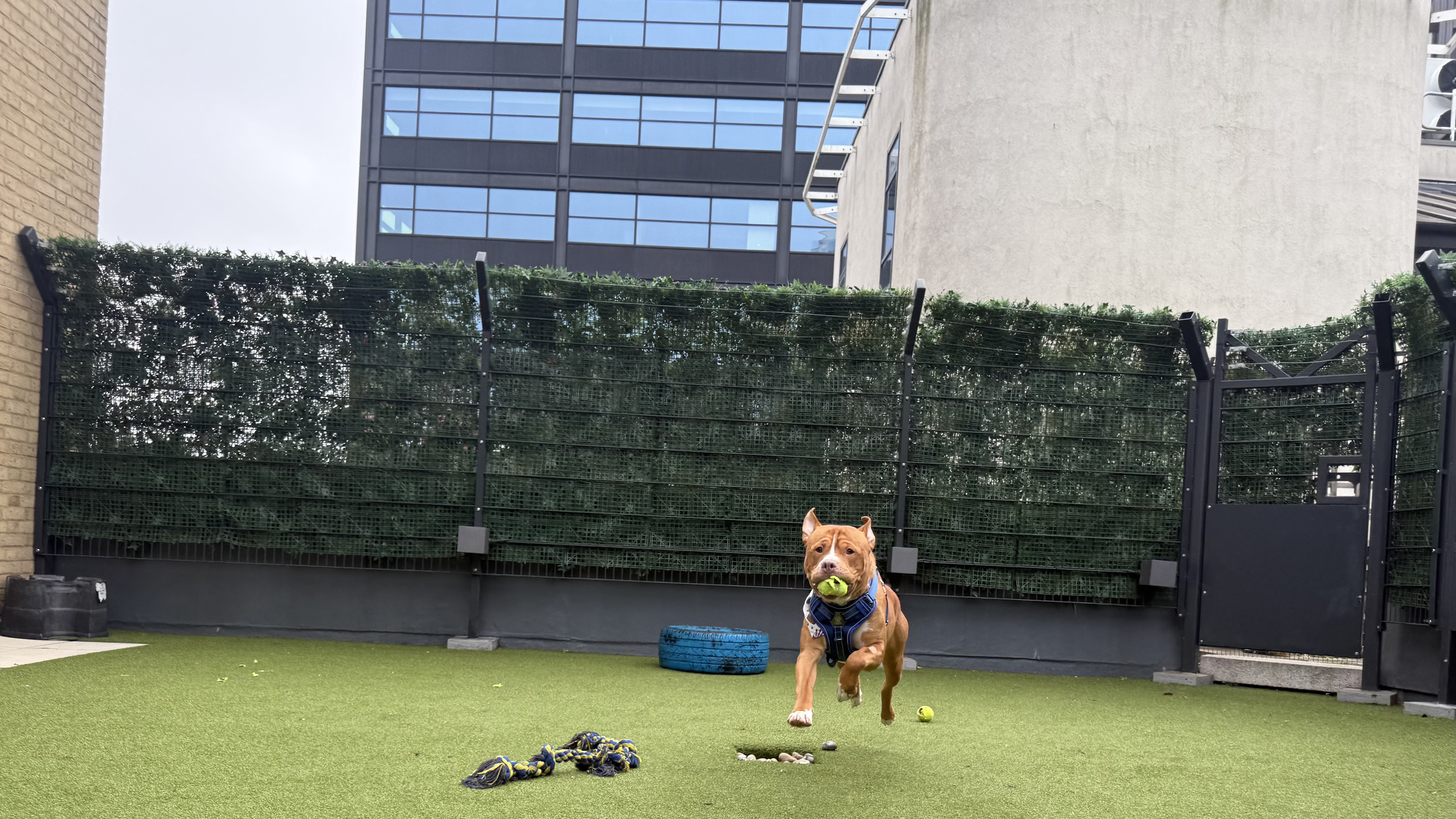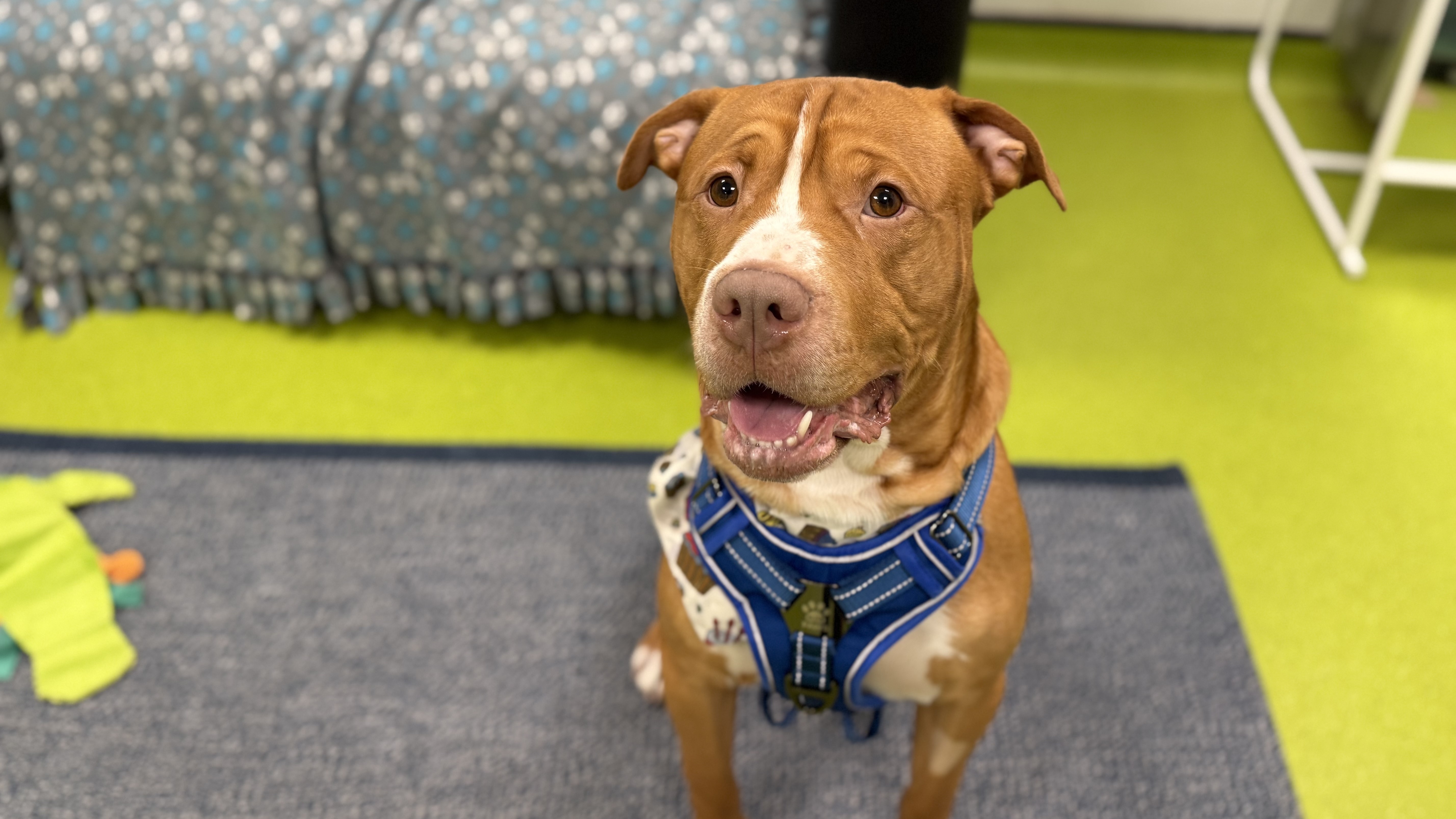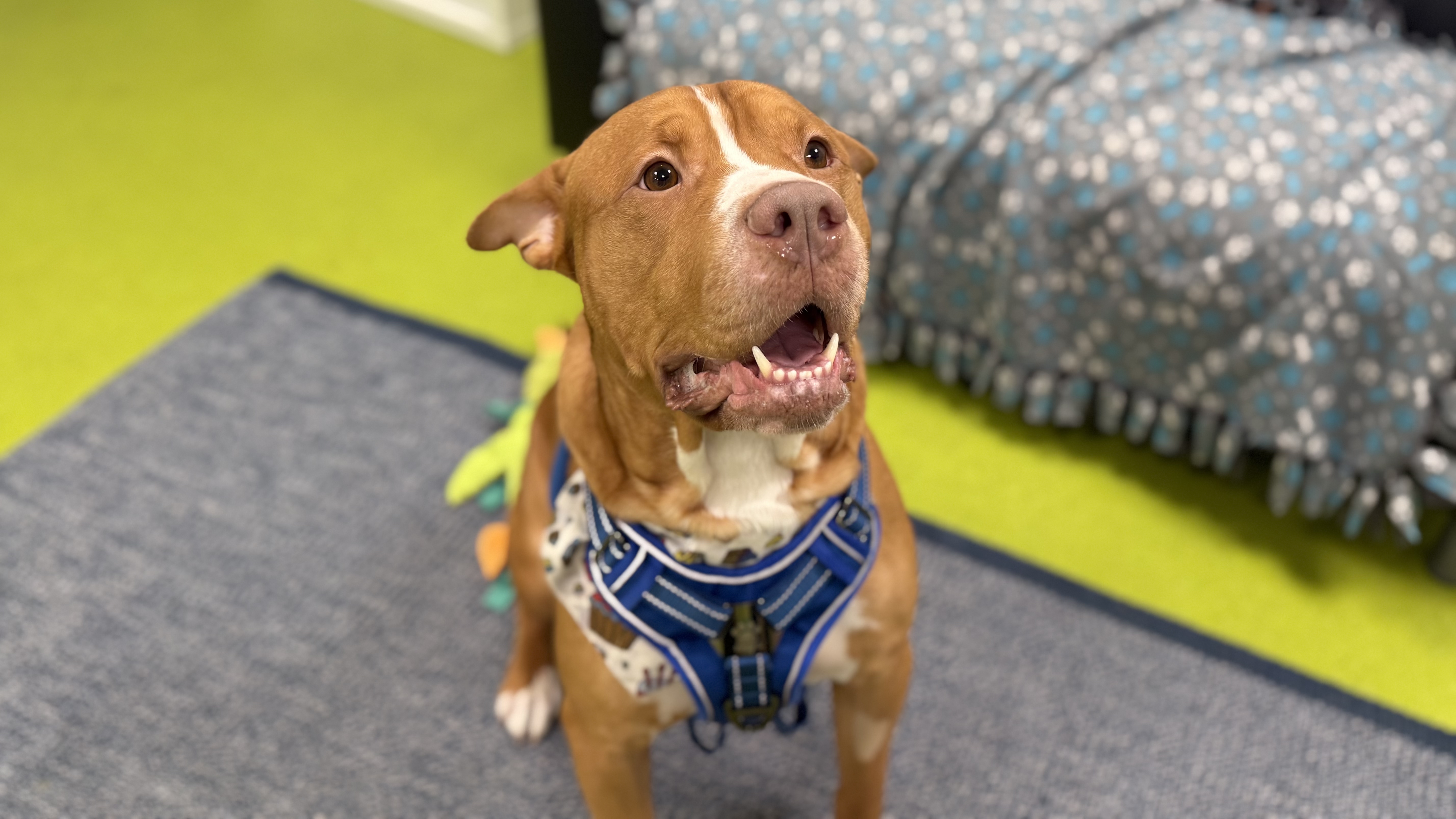 Since arriving at Battersea, Tucker has shown the same loving and affectionate character but with the added bonus of being the calmest bully on the block, who wants nothing more than to cuddle up with his favourite people and his favourite toy.