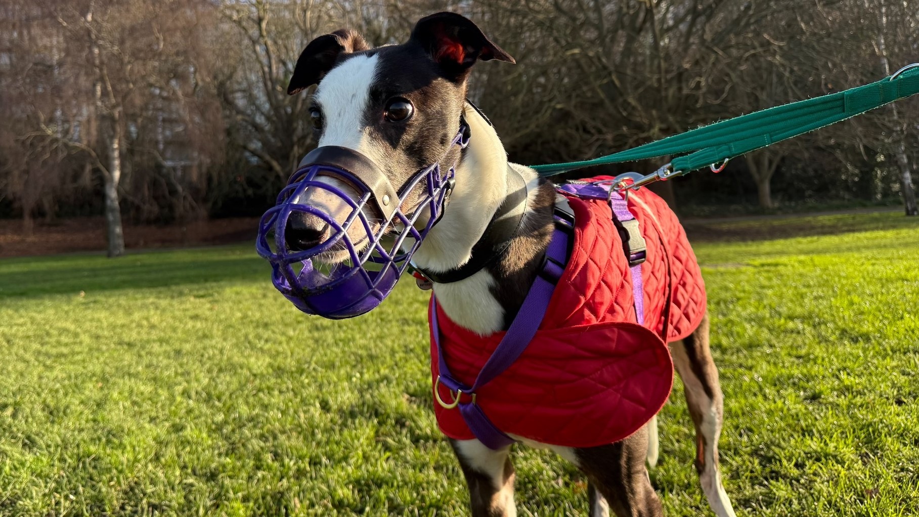 Due to chase behaviours seen during his stay here, as well as his racing background, he’ll need to stay on lead and muzzled when out on walks. The great thing is, he walks like a dream on lead, right by his handler's side!