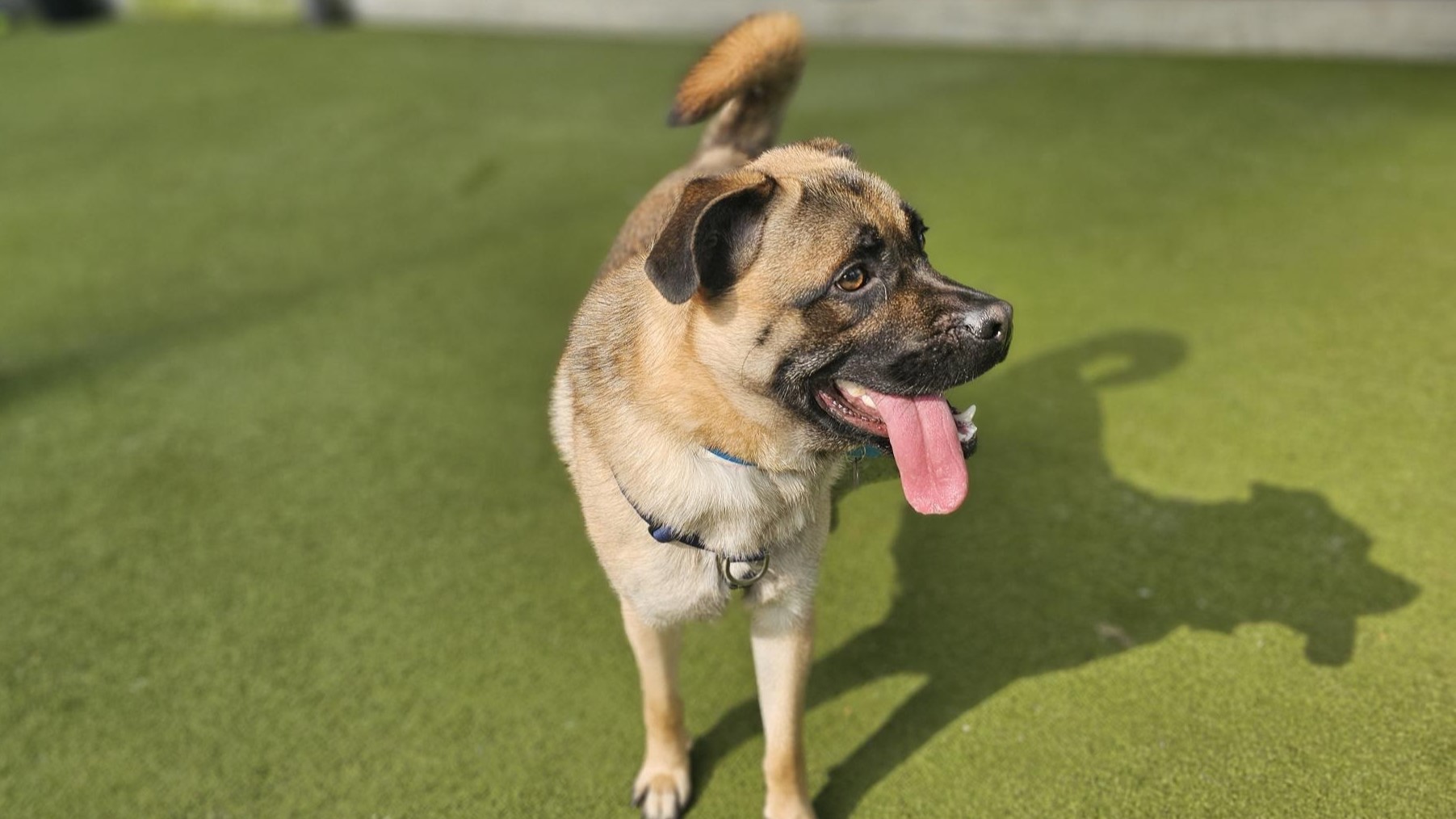 We believe Wilson is a German Shepherd mixed with a Pug so new owners should do a little research in order to understand his breed traits. He is still young so is looking for new owners who can provide him with some basic training to ensure he blooms into a well rounded adult.